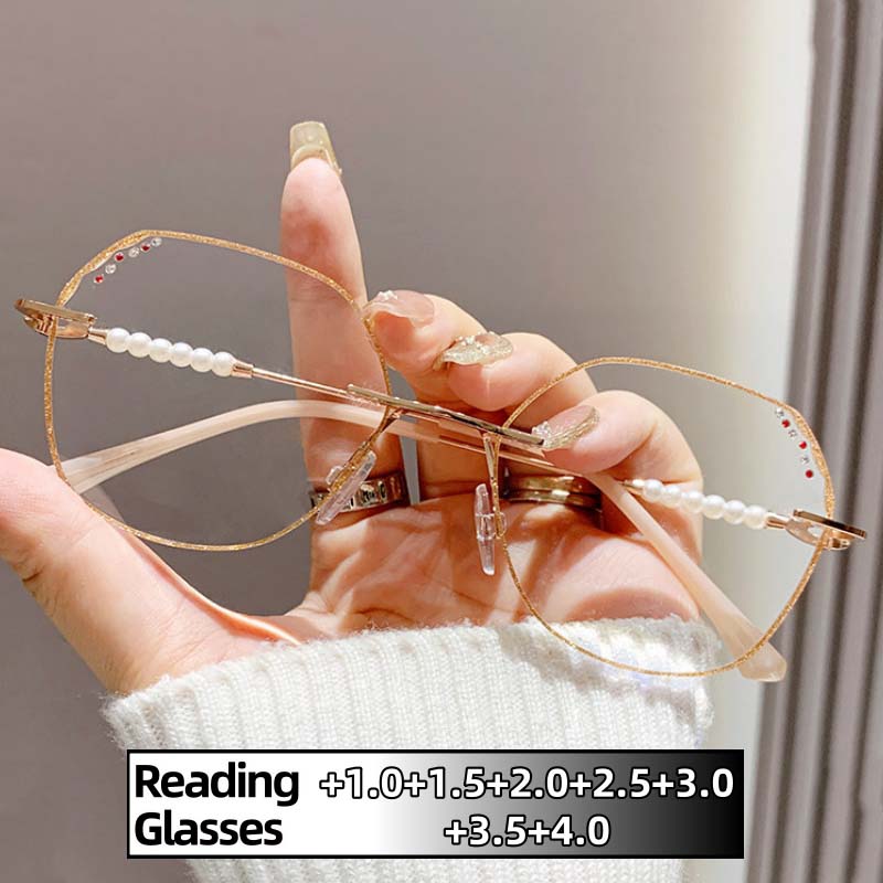 Fashion Presbyopia Eyeglasses Hd Clear Lens Unisex Far Sight Glasses Blue Light Blocking Frameless Diamond Trimmed Eyewear