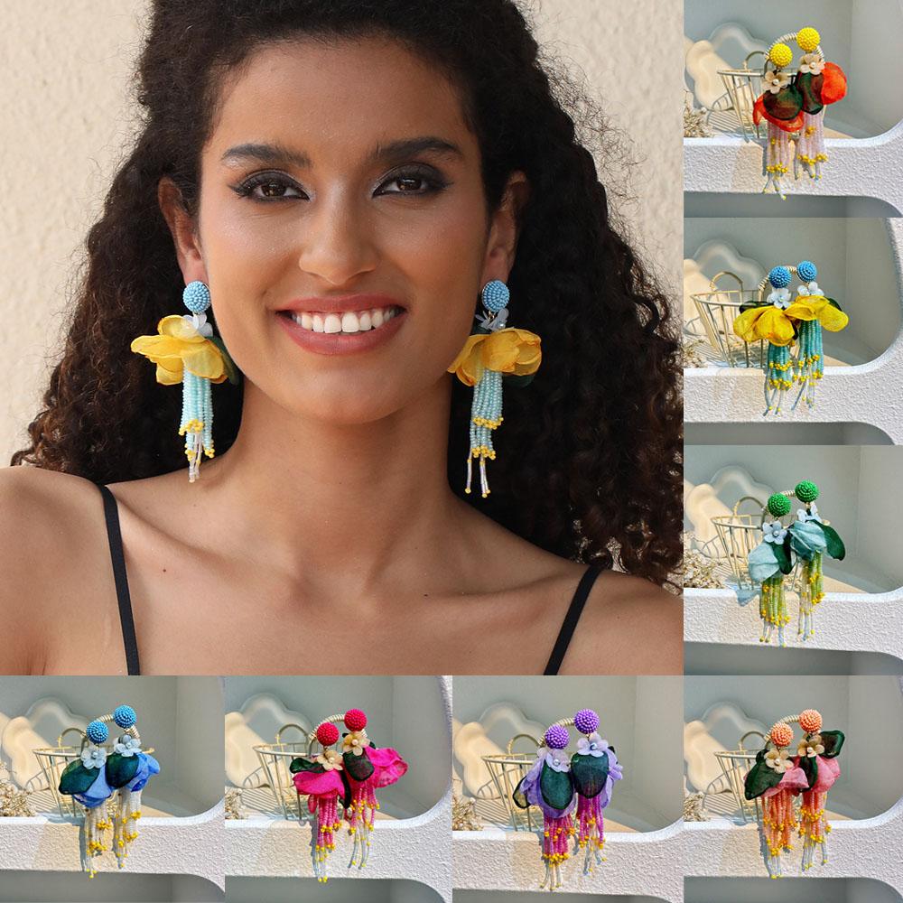 Exaggerated Big Fluffy Fabric Flower Beads Pendant Earrings for Women Trendy Wedding Drop Earring 2023 Bohemia Jewelry Accessory