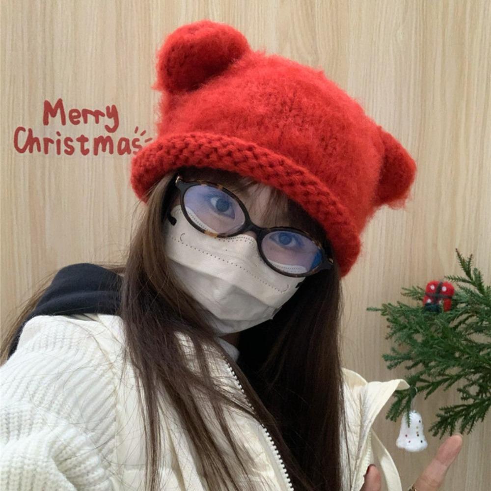 Y2K Bear Ear Woolen Hat Fluffy Brimless Beanie Cap Fashion Knitted Pullover Hat Women