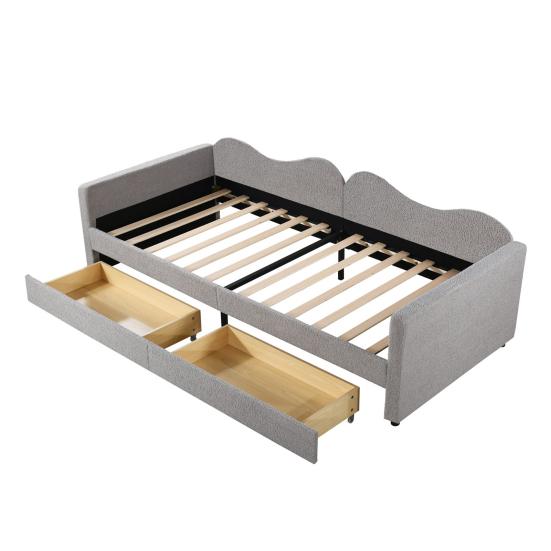 Fabric Cover Upholstered Bed with 2 Drawers Headboard Backrest Armrests Strong Wood Slat Support Bed Home Furniture