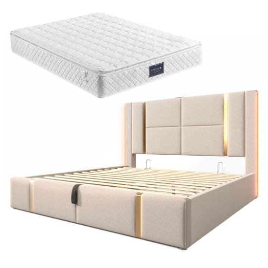 Linen Cover Charging Function Bed with Storage Space Mattress Headboard App Control Strong Wood Slat Support Bed Bedroom Furniture