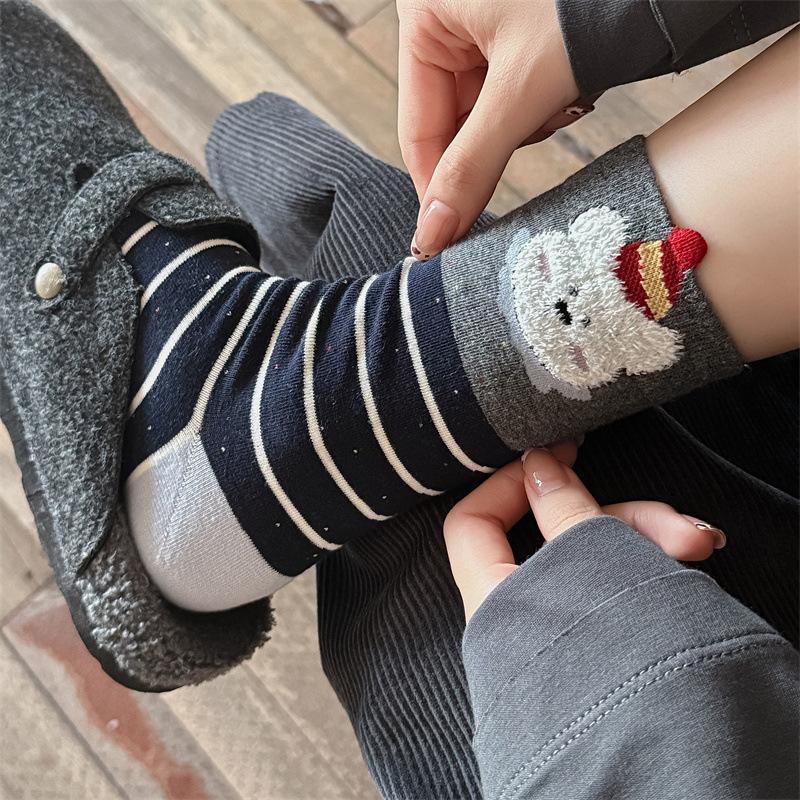 Autumn and Winter Socks for Women, Pure Cotton Striped Mid-calf Socks for Women, Cartoon Flocked Three-dimensional Socks for Women