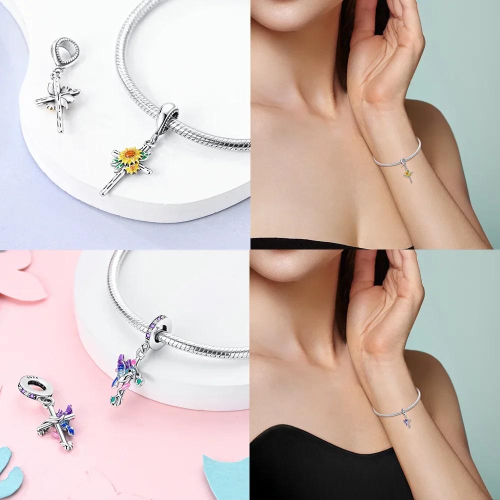 Pendants Woman Blue Copper Sunflower Purple Blue Cross Beads Charms Fit Original Pendant Bracelet Women Jewelry