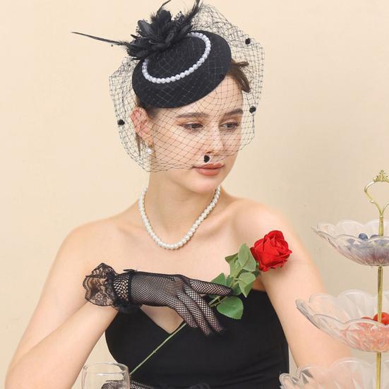 Yousheng Top Hat Hair Accessories Faux Pearls Feather Flower Veil Decor Dance Headdress Fascinator Headpiece Fashion Accessory