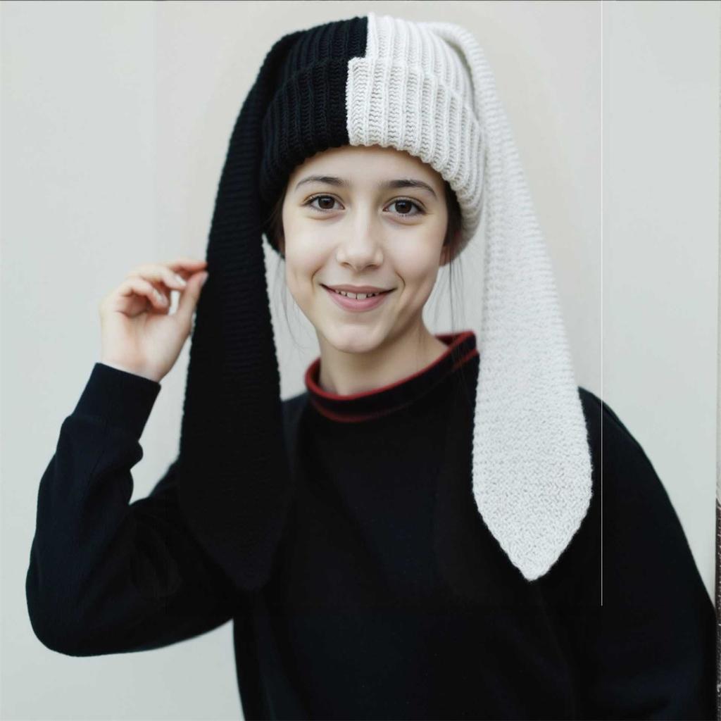 Sweet and Cute Rabbit Color Matching Long Ear Knitted Hat for Women Autumn and Winter Students Warm Ear Protection Wool Hat