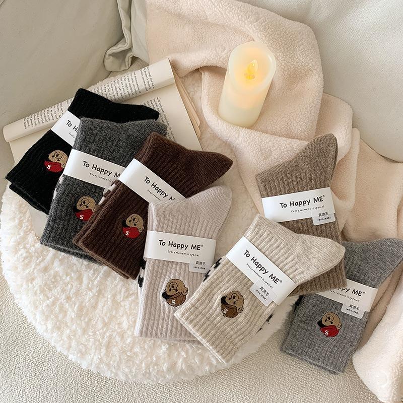 Autumn and Winter Socks: Women's Embroidered Bear Wool Socks, Thickened Warm Striped Cartoon Mid-calf Pile Socks
