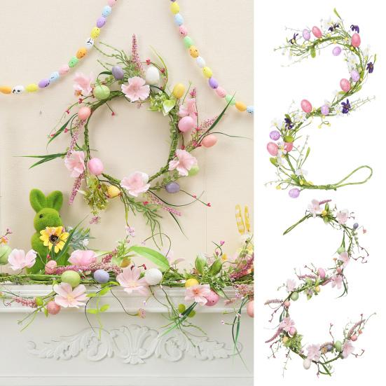 This easter garland features high-quality PE+PVC mixed rattan, offering a realistic texture with soft, matte-coated leaves and eggs. Crafted from environmentally friendly materials, it is odorless and meets interior decoration safety standards. Designed for versatile use, it can be hung on doors, walls, or windows, or wrapped around candlesticks and photo frames to enhance living rooms, dining tables, shopping malls, or greenhouses with festive charm.