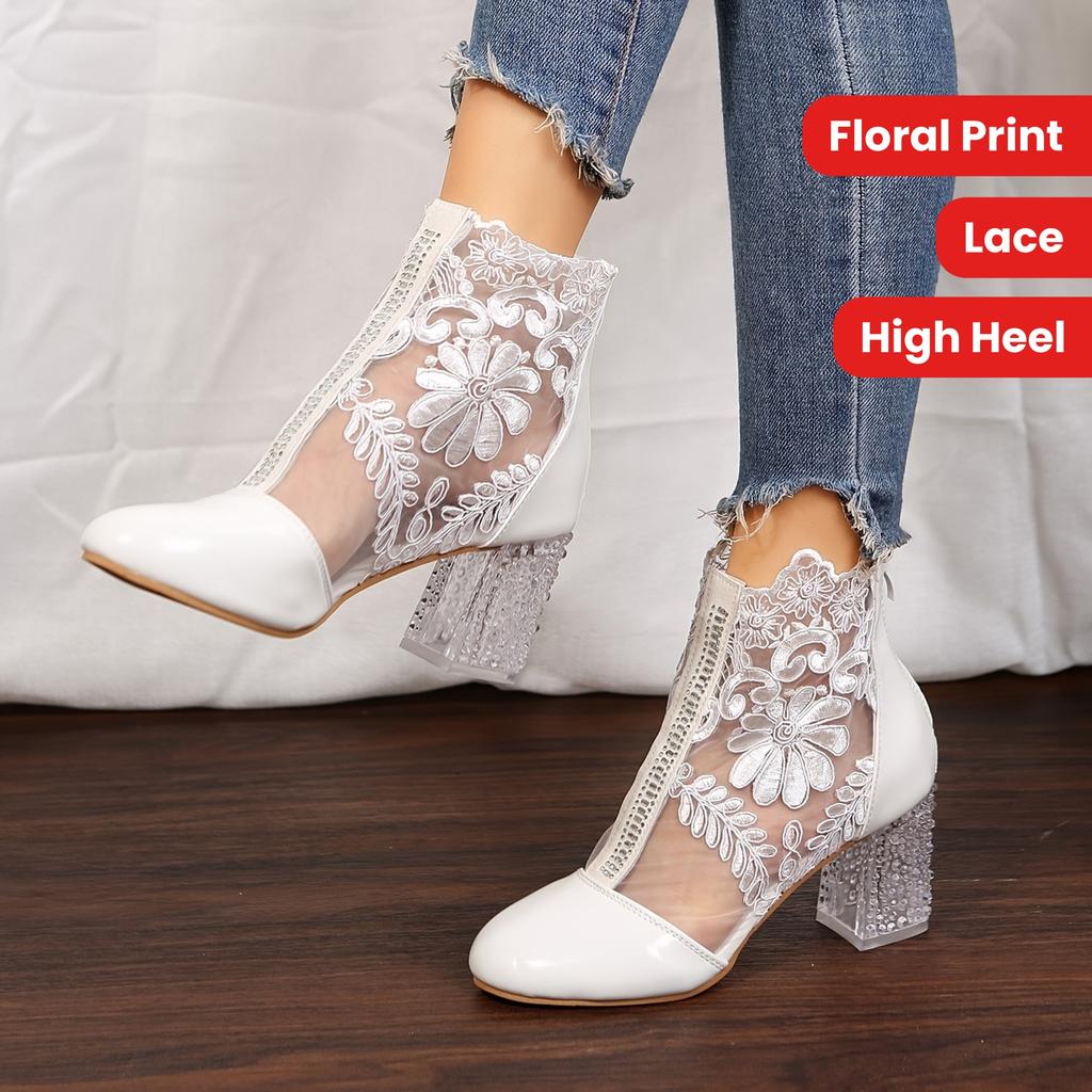 High Heel Women's Ankle Boots, Floral Print Lace, Back Zipper, Round Toe, Square Shoes