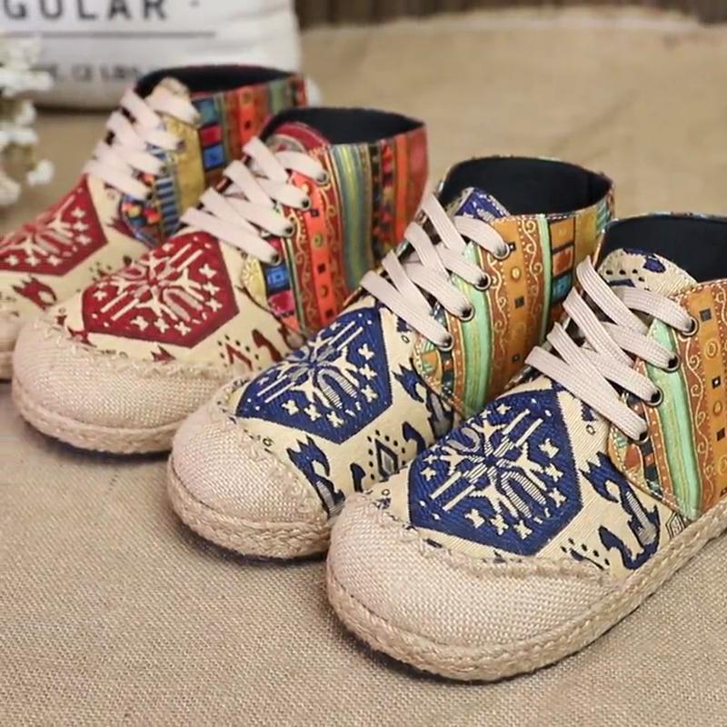 Handmade Embroidery Round Toe Lace-up Floral Sewing Linen Cotton Shoes Ankle Boots For Women