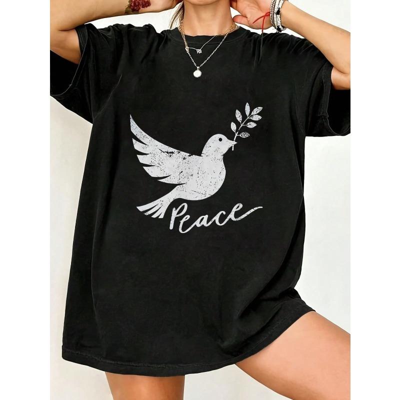 Black Oversized T Shirt With Peace Dove Print And Olive Branch For Casual Wear