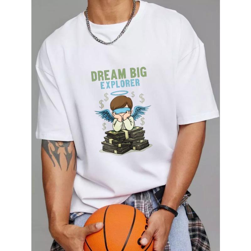 Crewneck T Shirt White Dream Big Explorer Angel with Money Stack Graphic for Casual Wear and Street Style