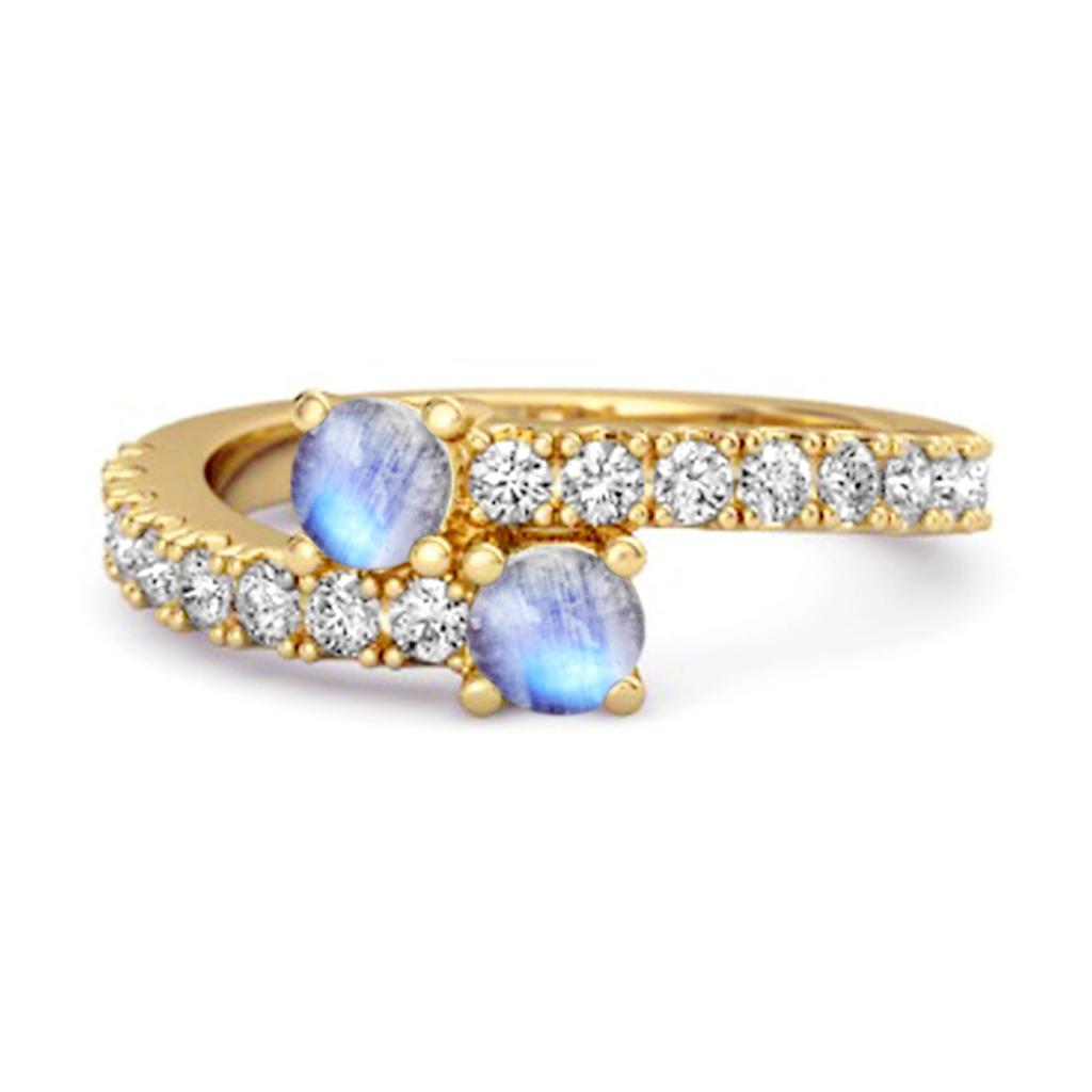 Moonstone bypass ring in sterling silver with 0.60 Ct total and white CZ pavé accents. A glowing, peaceful everyday piece.