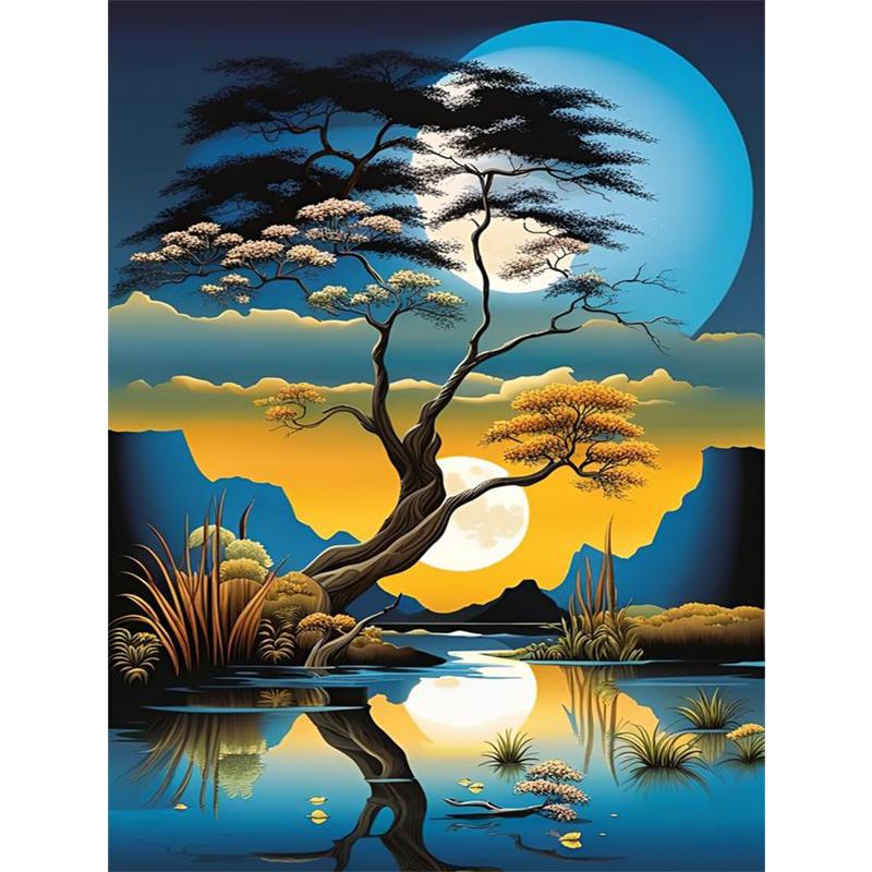 5DDIY Diamond Painting, Hand-painted Moonlight Tree Reflection, Full Embroidery Kit Home Decoration Needlework
