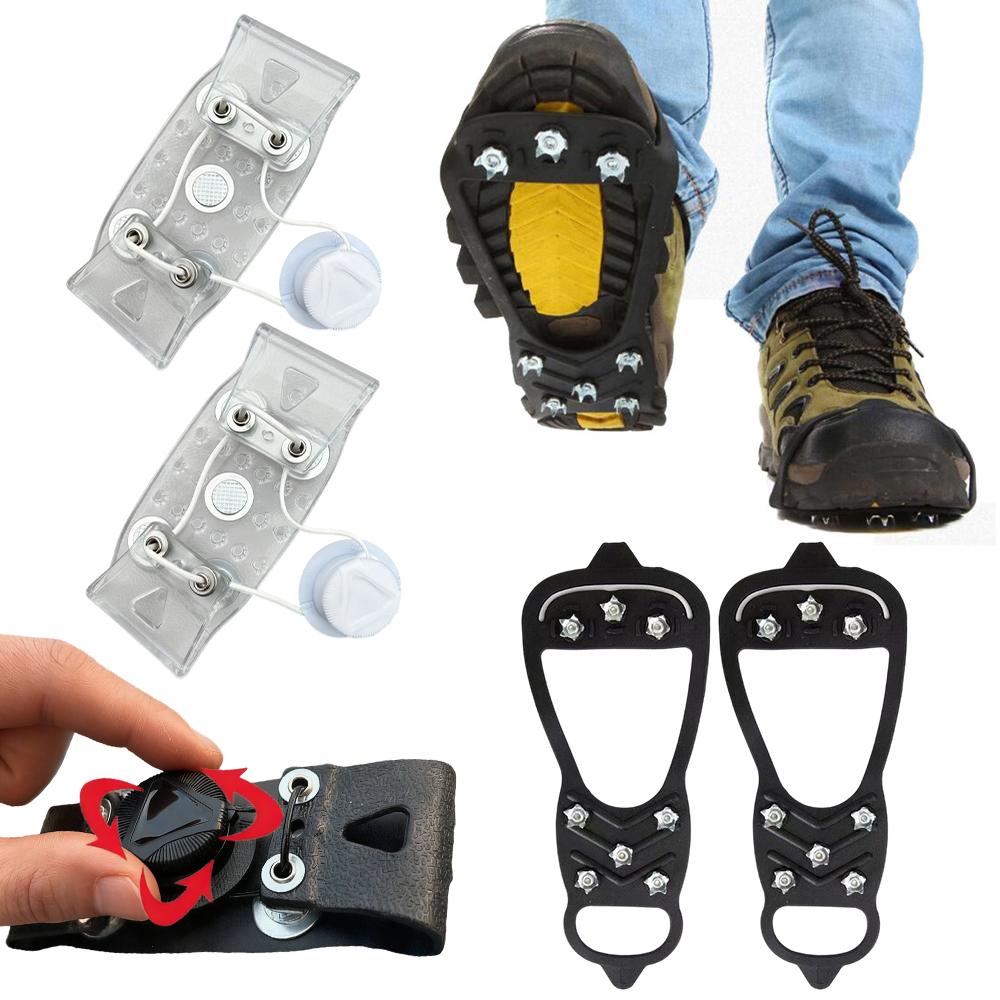 [Easy to Wear]: 8-Tooth Crampons Just stretch the front end of the crampon and place it in front of the shoe, then put the back side on the heel. The 5-tooth crampons only need to be worn on the shoes, and the tightness can be adjusted with the knob according to the size of the shoe upper.
