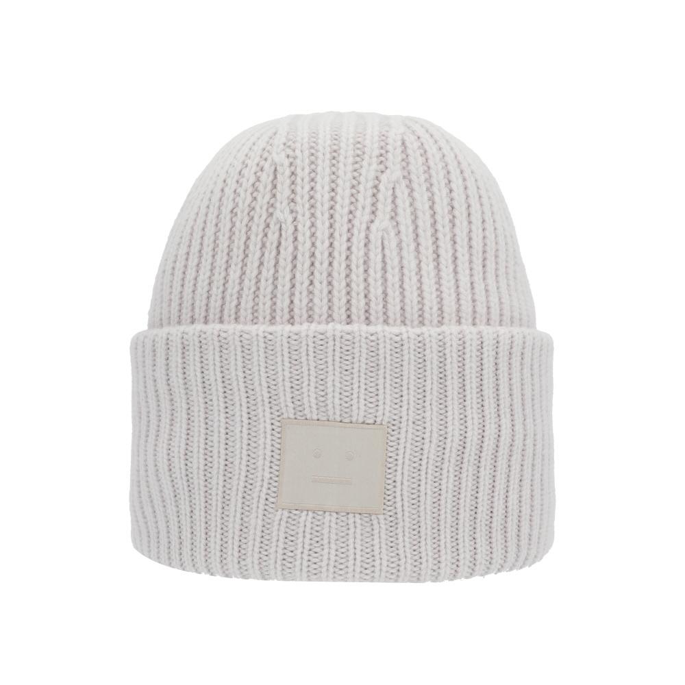 The Acne Studios C40424 Large Face Logo Patch Beanie is a knit beanie made in a light gray color. This beanie features a large-sized embroidered face logo patch on the front, completing a luxurious design with ribbed detailing. It serves as a winter fashion item that warmly hugs the face, making it suitable for both casual and refined styles. The unisex design fits well for both women and men.