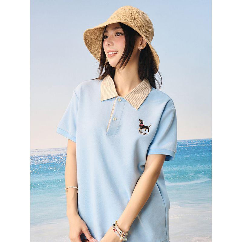 HACR Women Harshandcruel Korean Style Retro College Plaid Collar Fake Two-Piece Color Block Embroidery Polo Shirt