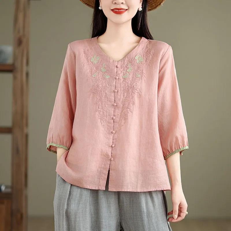 Summer New Mid-sleeve Artistic Shirt Embroidered Loose Commuter Shirt Retro Buttoned Top