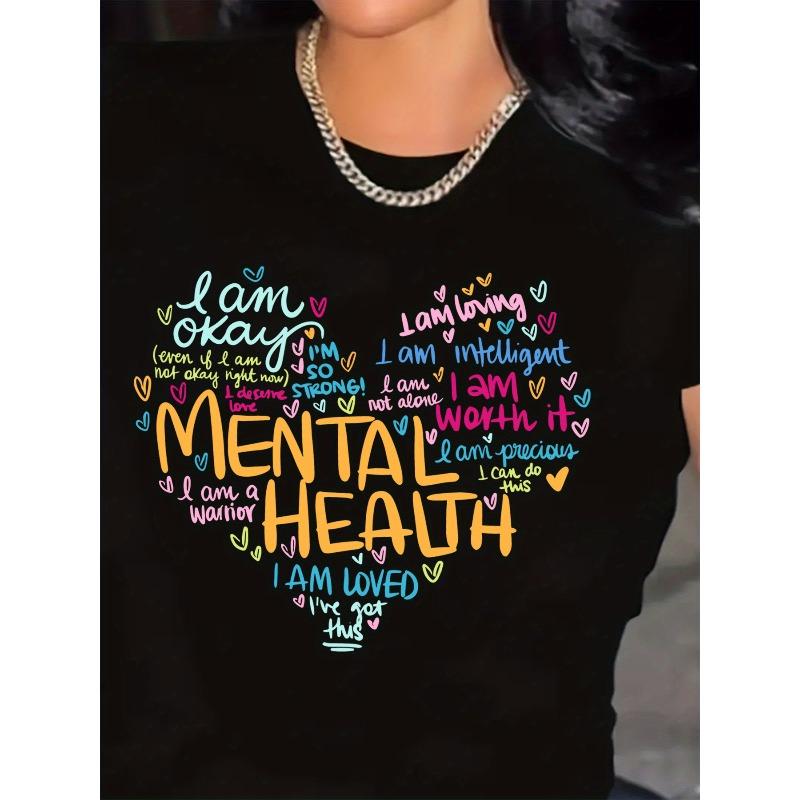 Plus Size Women's Mental Health Awareness Alphabet Print T-Shirt Casual Crew Neck Short Sleeve Top