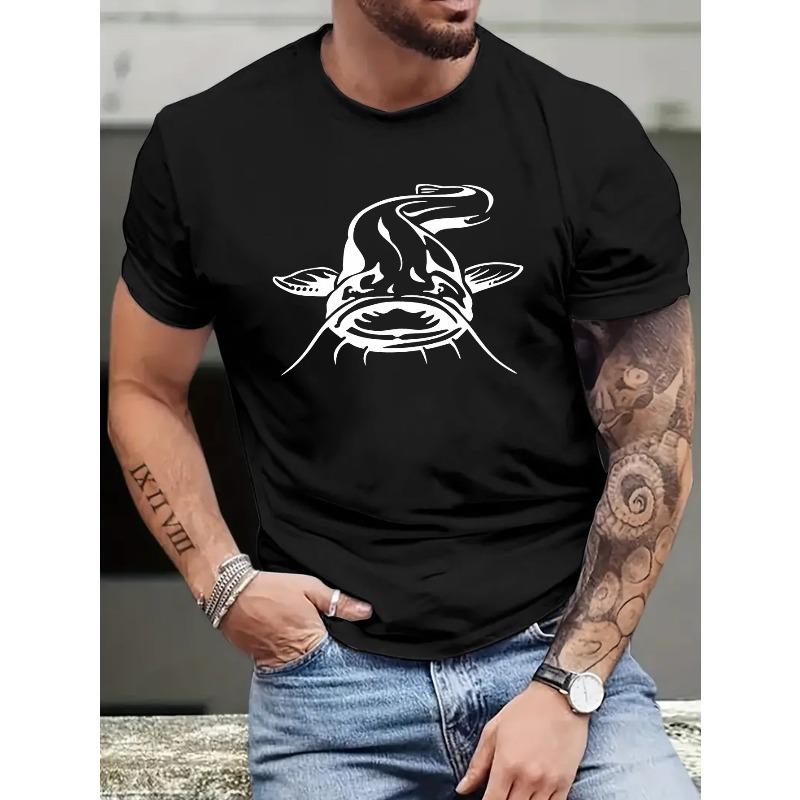 European Sizes Catfish Print Tee Shirt, Tees For Men, Casual Short Sleeve T-shirt For Summer