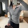 The Elegant Korean Style Grey Slim Fit Lapel T-shirt is a stylish and versatile base layer top designed for women's autumn and winter wardrobes. Made from high-quality cotton, this long sleeve shirt offers both comfort and breathability. Its solid pattern and V-neckline add a touch of sophistication, making it a perfect choice for layering or wearing on its own. The slim fit design ensures a flattering silhouette, while the grey color provides a neutral, elegant look that can easily be paired with various outfits.