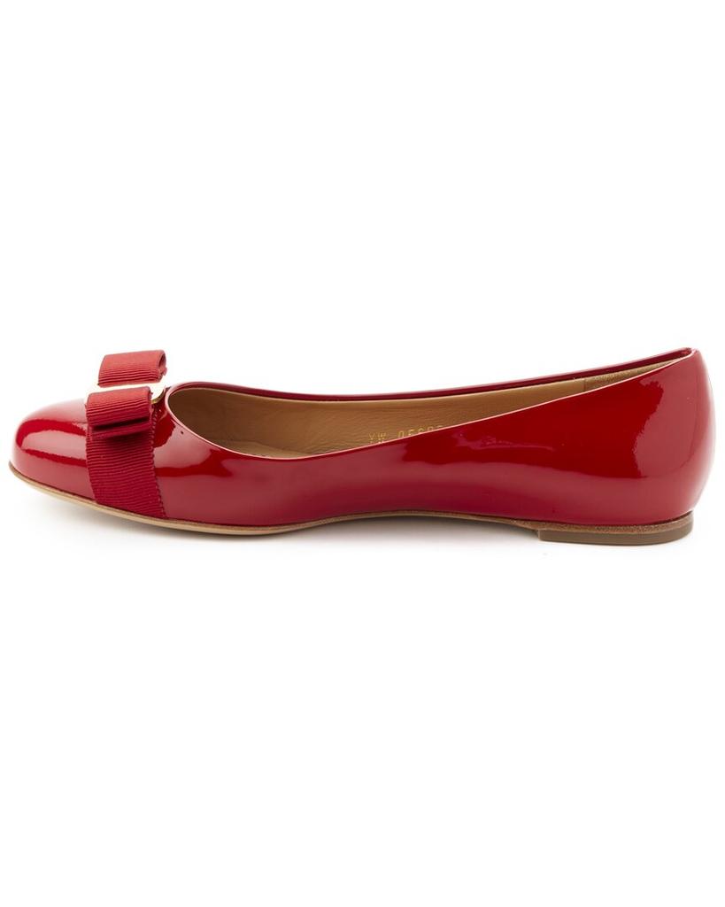 Introducing the iconic 'Ferragamo Varina Patent Ballet Flat' from renowned brand Salvatore Ferragamo. These stylish flats are perfect for women who appreciate luxurious Italian craftsmanship. The red patent leather is accentuated by a gold-tone and grosgrain Vara bow, adding a touch of elegance to any outfit. The lightly padded leather insole and smooth leather sole ensure all-day comfort and durability. Please note that sizing varies - B indicates narrow, C indicates standard, D indicates wide, and M indicates medium. Rest assured, our products are 100% genuine, sourced from trusted independent suppliers. Add a touch of sophistication to your wardrobe with the timeless Ferragamo Varina Ballet Flats.