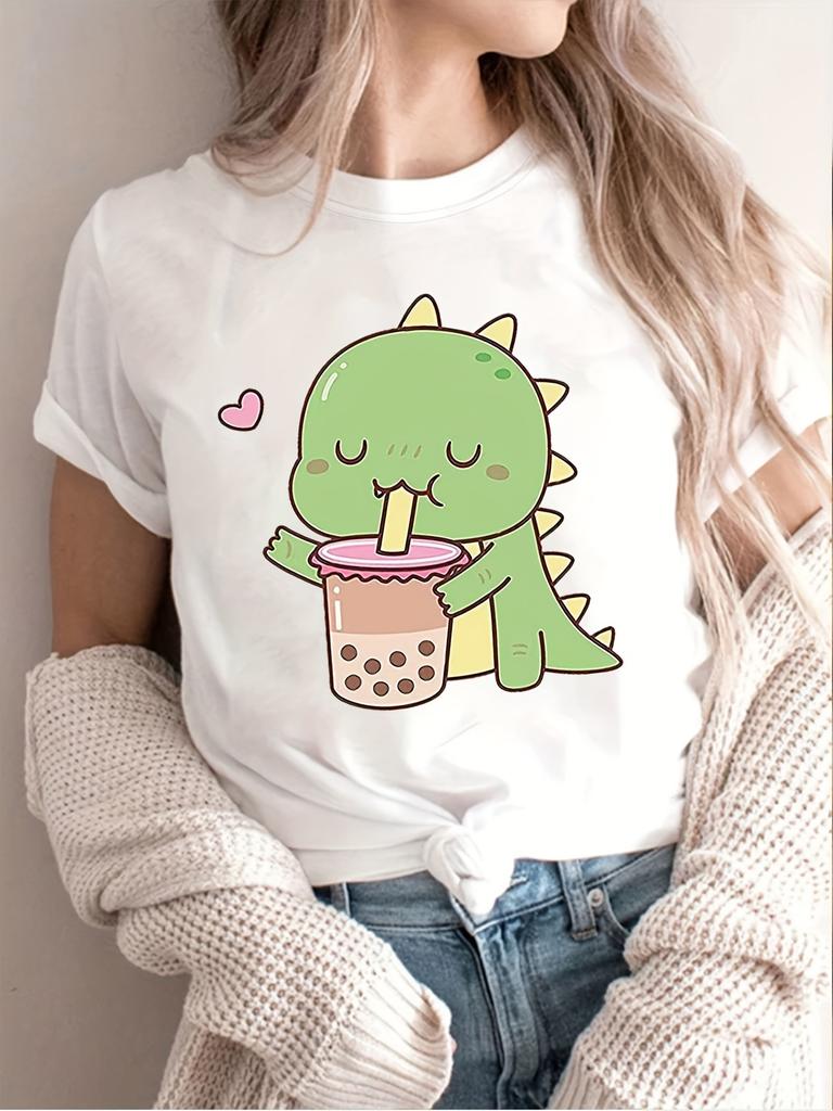 Cute Little Dinosaur Print Crew Neck Short Sleeve Casual Tshirt Womens Clothing Womens Harajuku Short Sleeve Casual Aesthetic