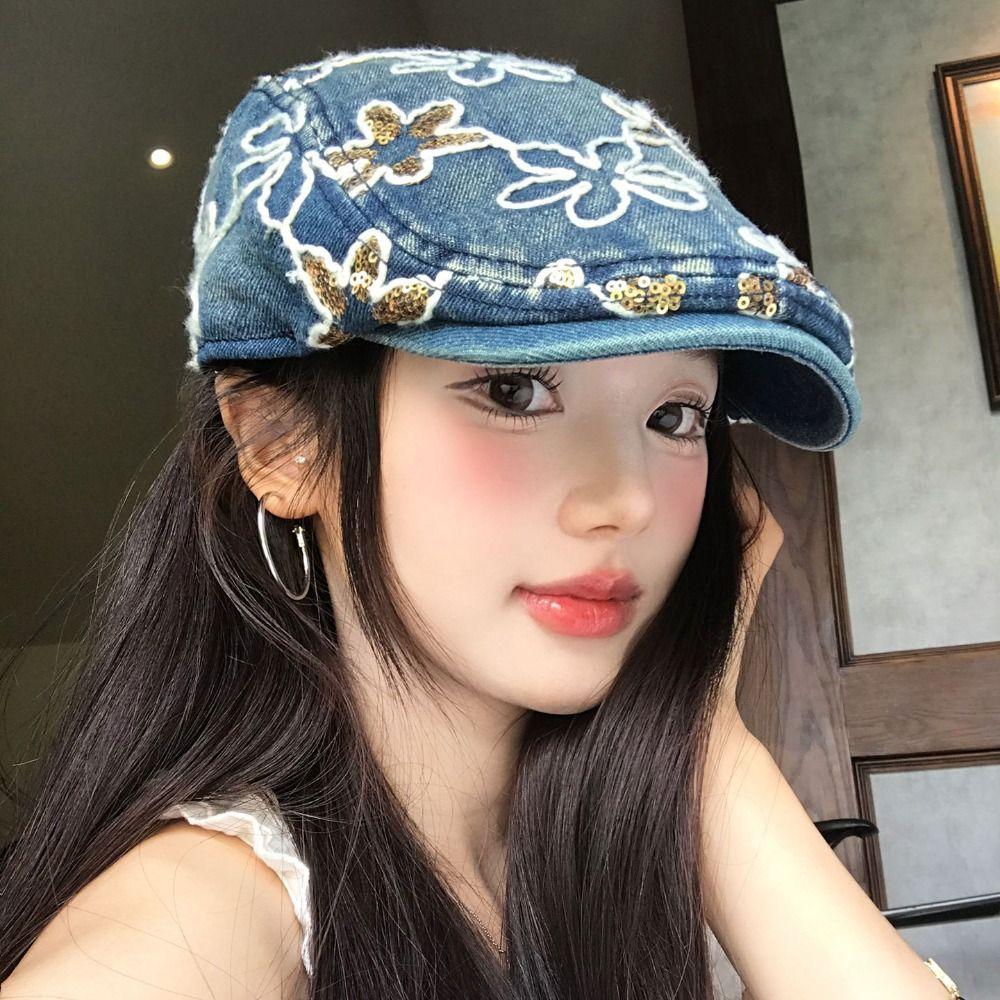 Ethnic Style Embroidery Flower Forward Hat Y2k Glitter Beret Casual Cadet Cap Outdoor