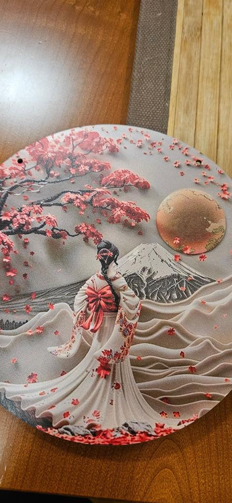 Tre En vakker japansk kvinne i kimono står under kirsebærblomsttreet - Kunstnerisk veggdekor, treskilt, for dør, vegg, hjem, rom,