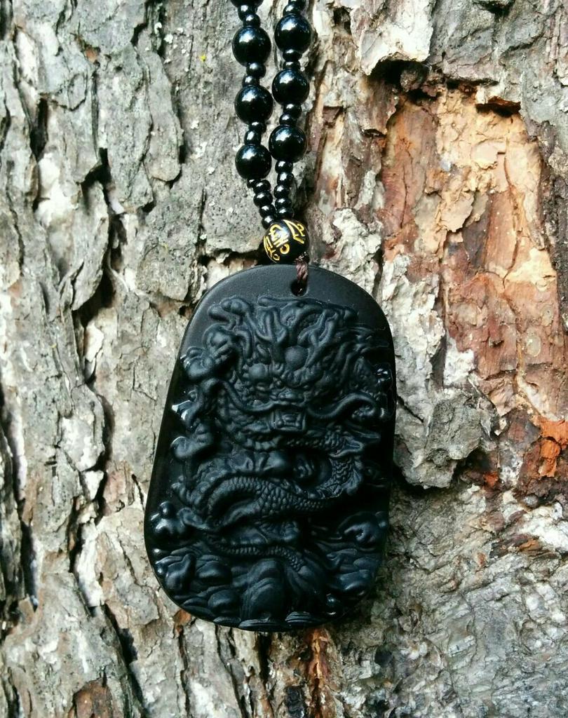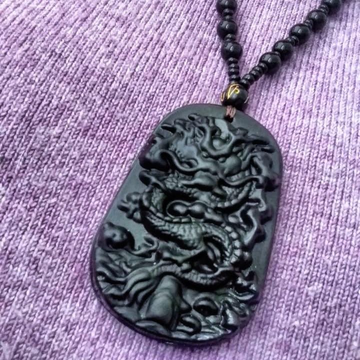 Colier negru cu frânghie cu mărgele de bun augur pentru femei, totem cu dragon din obsidian natural sculptat