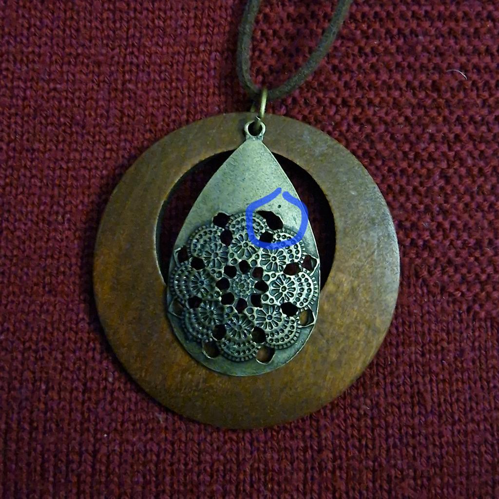 Chestia este foarte drăguță, un șnur lung de piele, un pandantiv original din lemn și metal. Dar scot o stea pentru că inelul de lemn este despicat într-un loc și pare a fi roade (prost lustruit) în altul. Mai ales că l-am luat cadou.