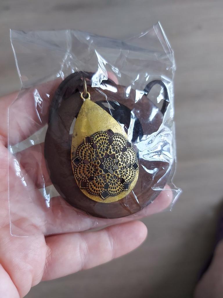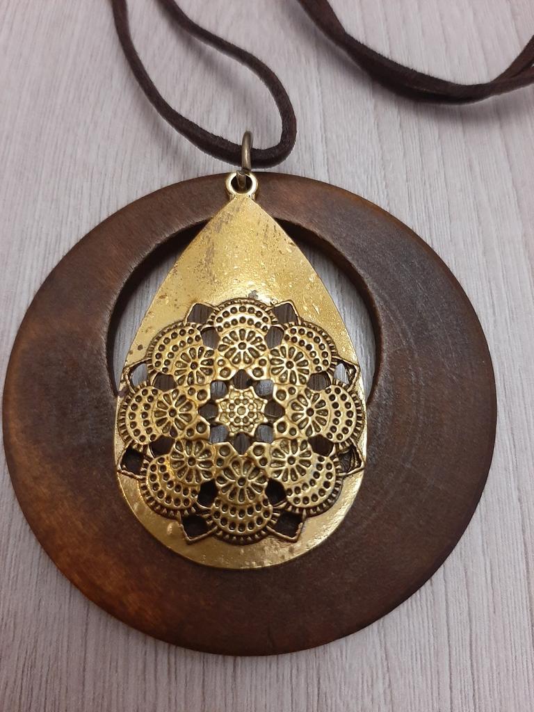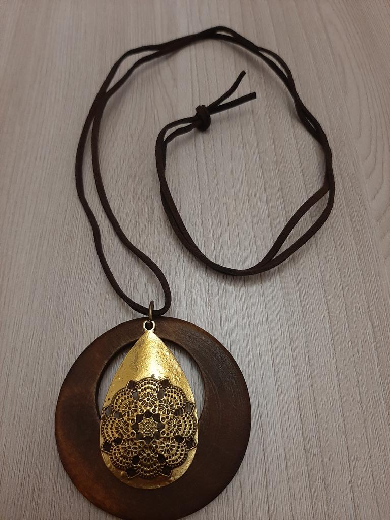 Un pandantiv foarte interesant, plastic aspect lemn, mult mai inchis decat in poza, pe un snur din piele adevarata, foarte interesant pentru hainele de vara...