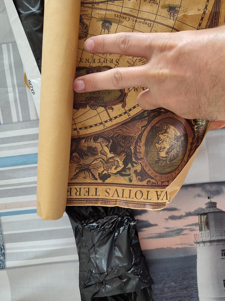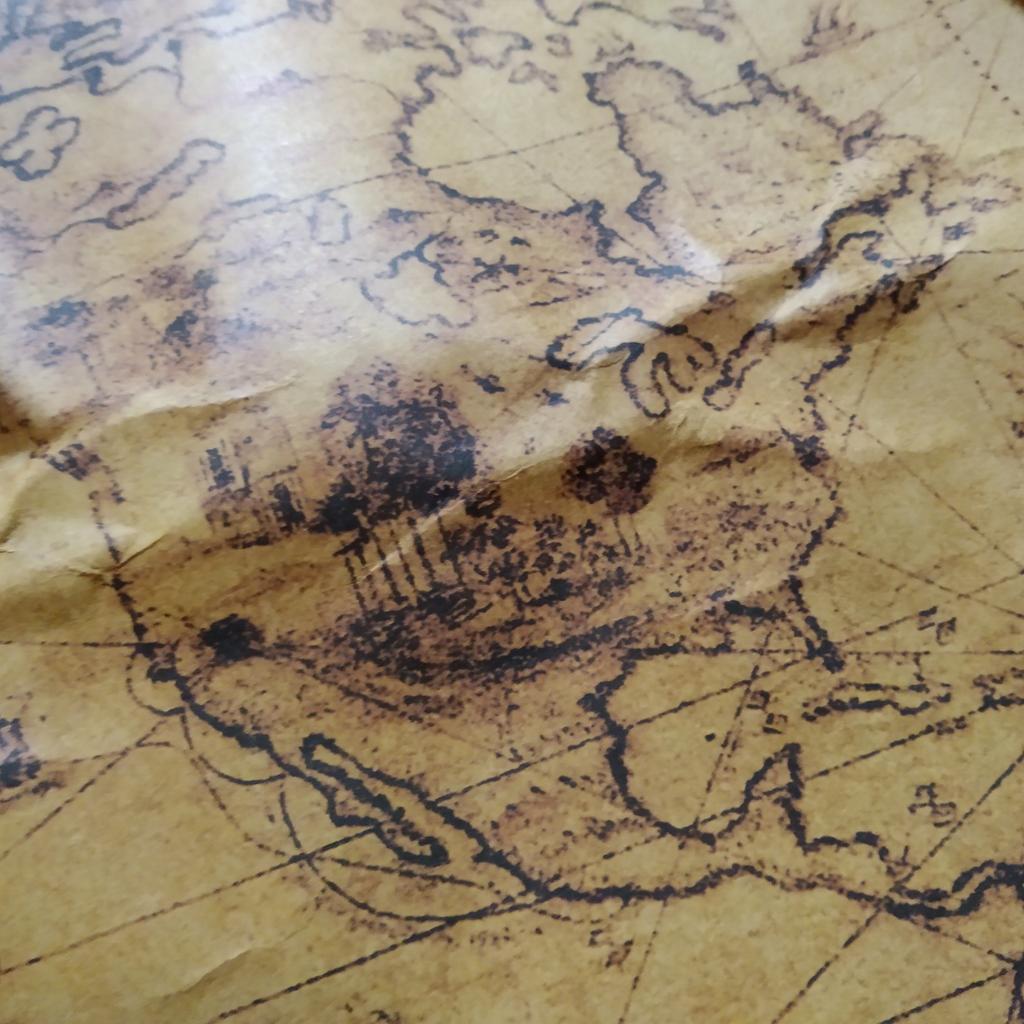 Cartonul este gros. De la distanță pare mișto, ca dintr-o corabie de pirați. Puteți citi doar numele continentelor. Contururile sunt neclare, claritatea are de suferit. Deci doar un decor cool și nu o hartă))