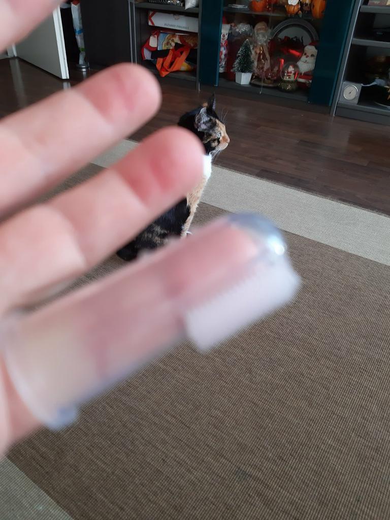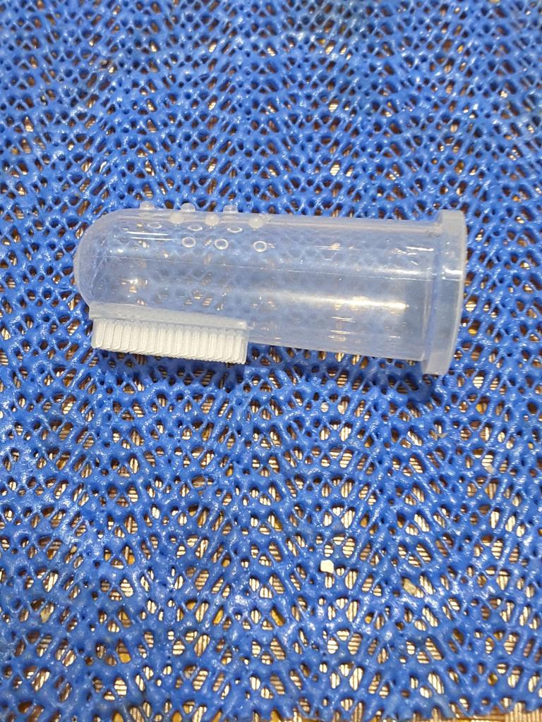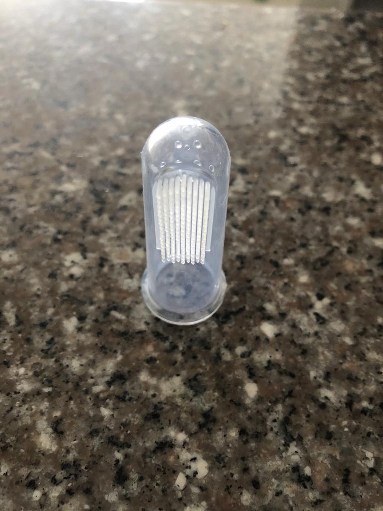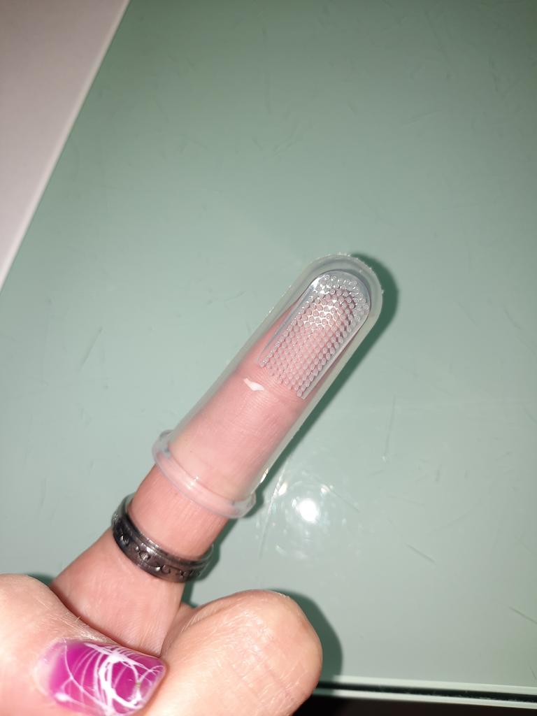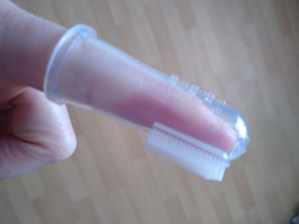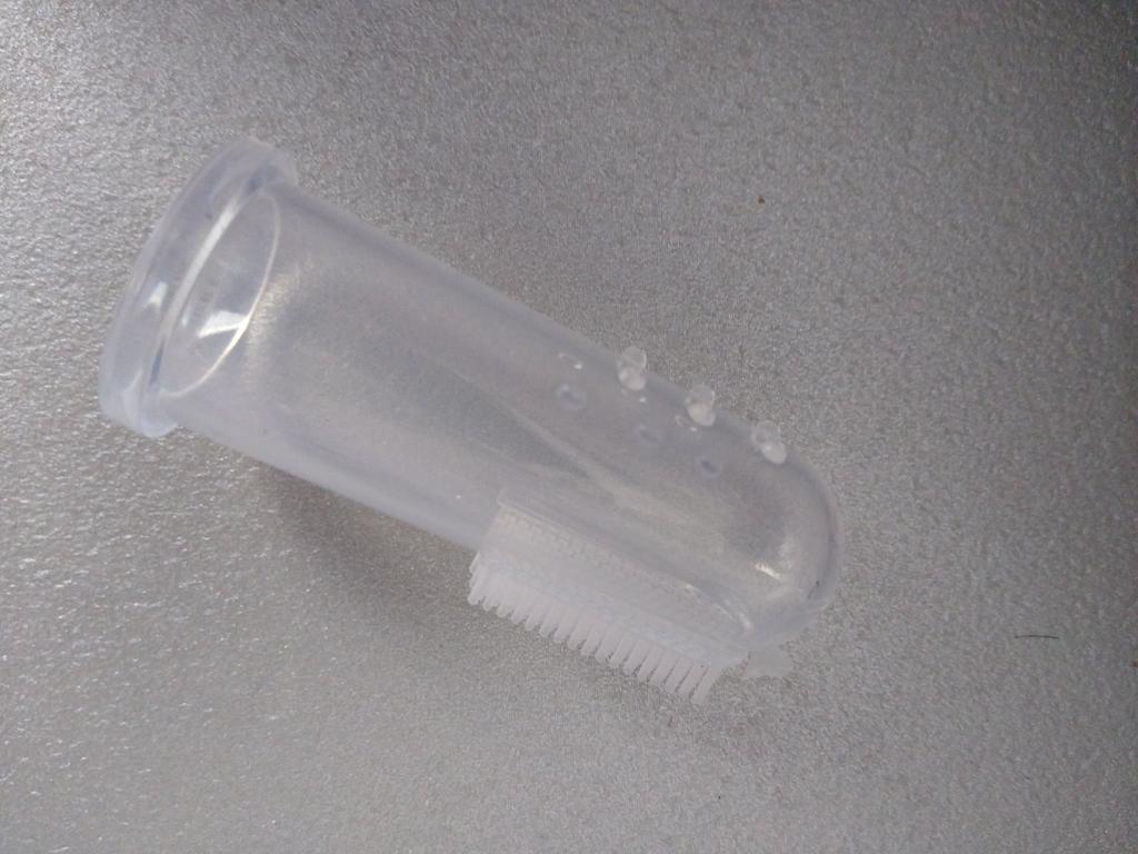 Periuta de dinti pentru caine poate fi folosita fara probleme...dar este putin prea ingusta pentru degetul aratator.