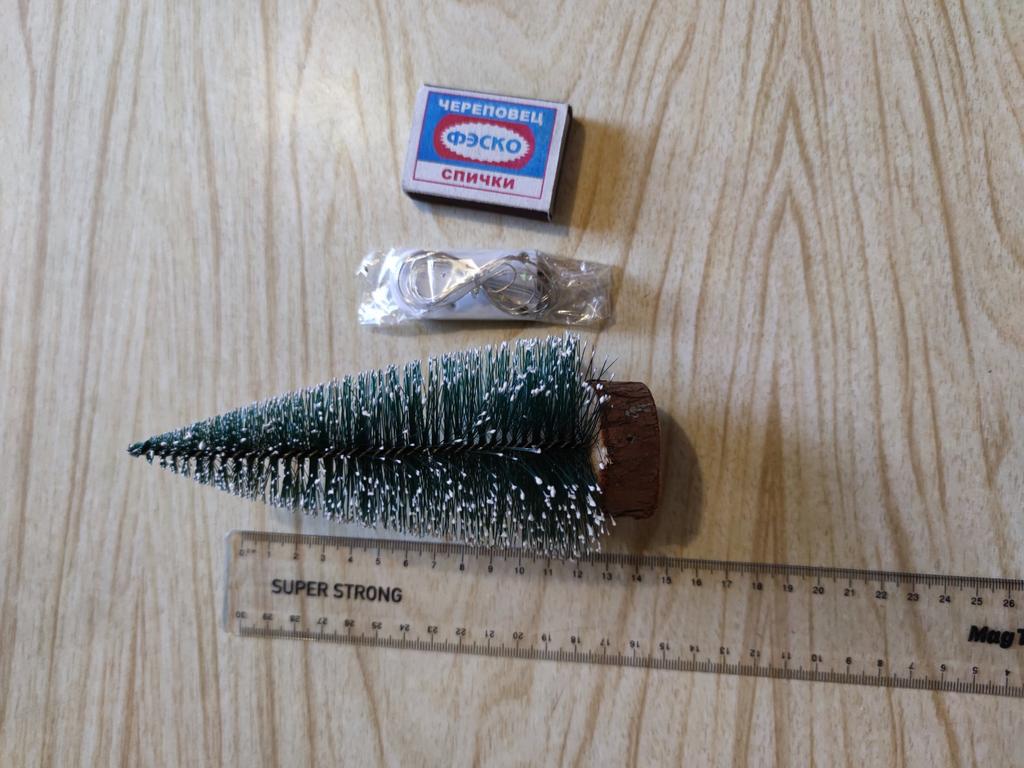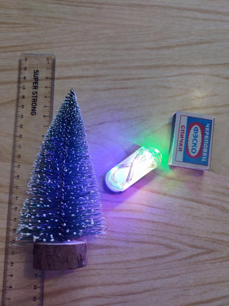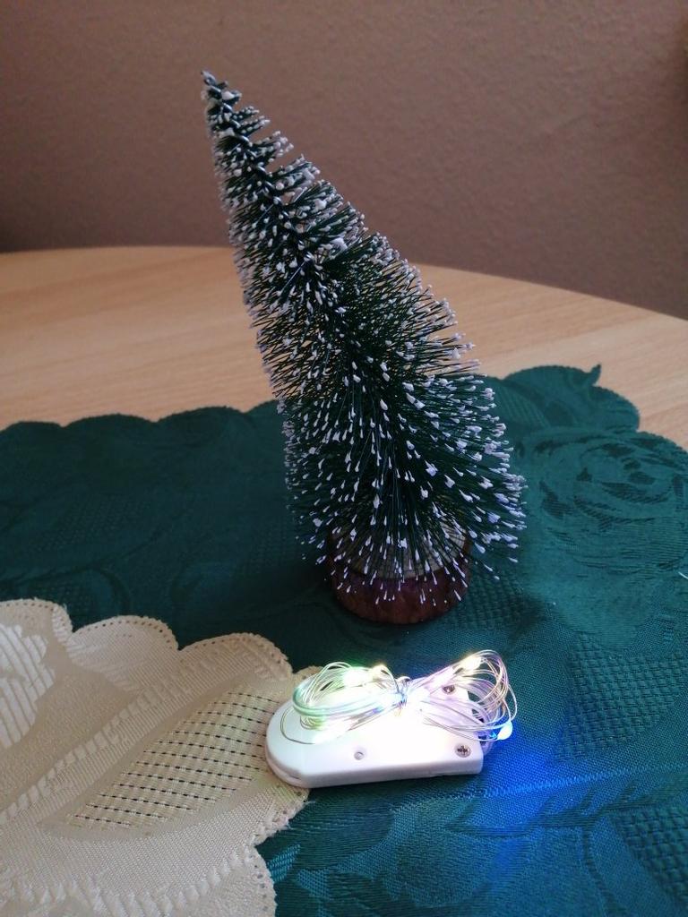 Drăguț brad artificial de 15 cm montat pe un disc rotund de lemn. Lanțul de lumini cu 10 LED-uri trebuie atașat singur de brad. Pot să recomand doar bradul strălucitor.