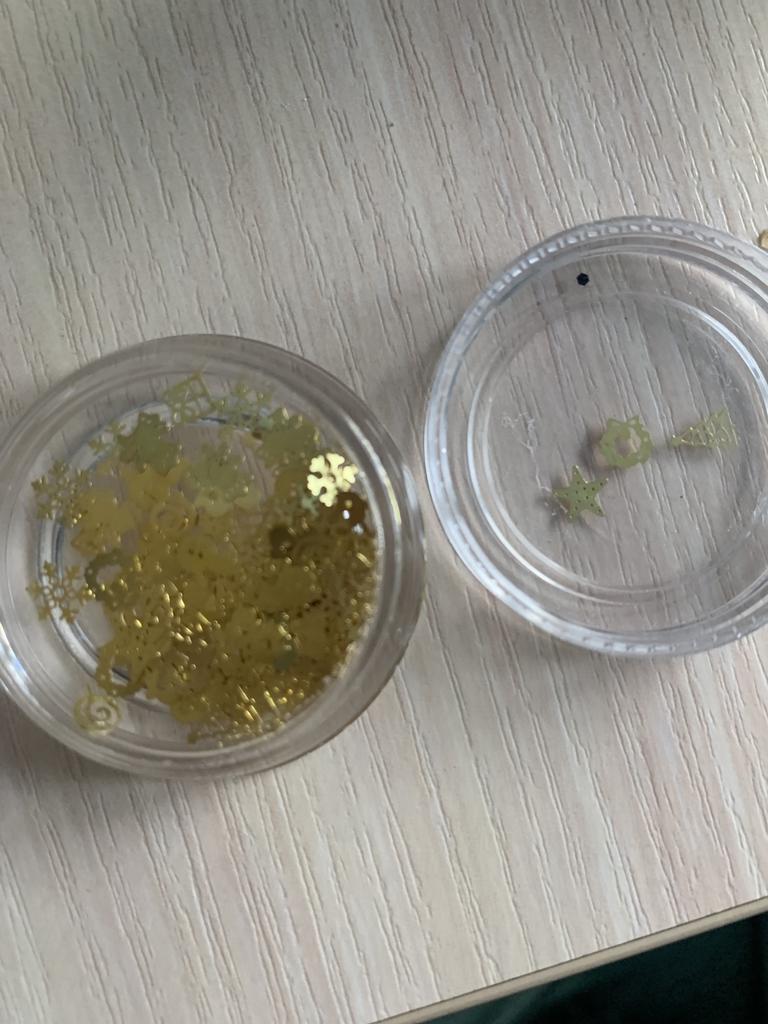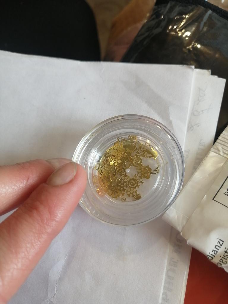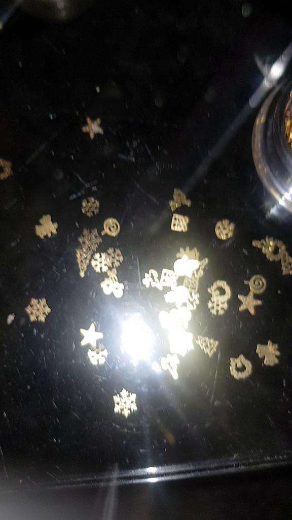 Totul pare ok. Modelele sunt realizate dintr-o placa subtire aurie. Ele pot fi lipite pe lipici sau amestecate în gel. De asemenea, se lipesc bine pe un blat obișnuit. Deoarece decorațiunile sunt metalice, pot fi îndoite după forma unghiilor. Sunt fericit. Il recomand cu caldura tuturor.