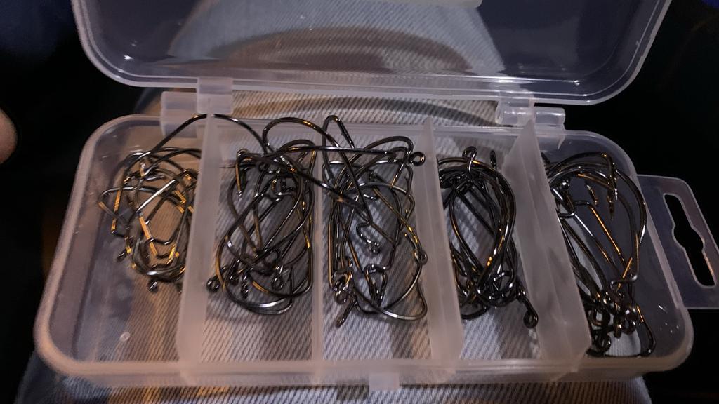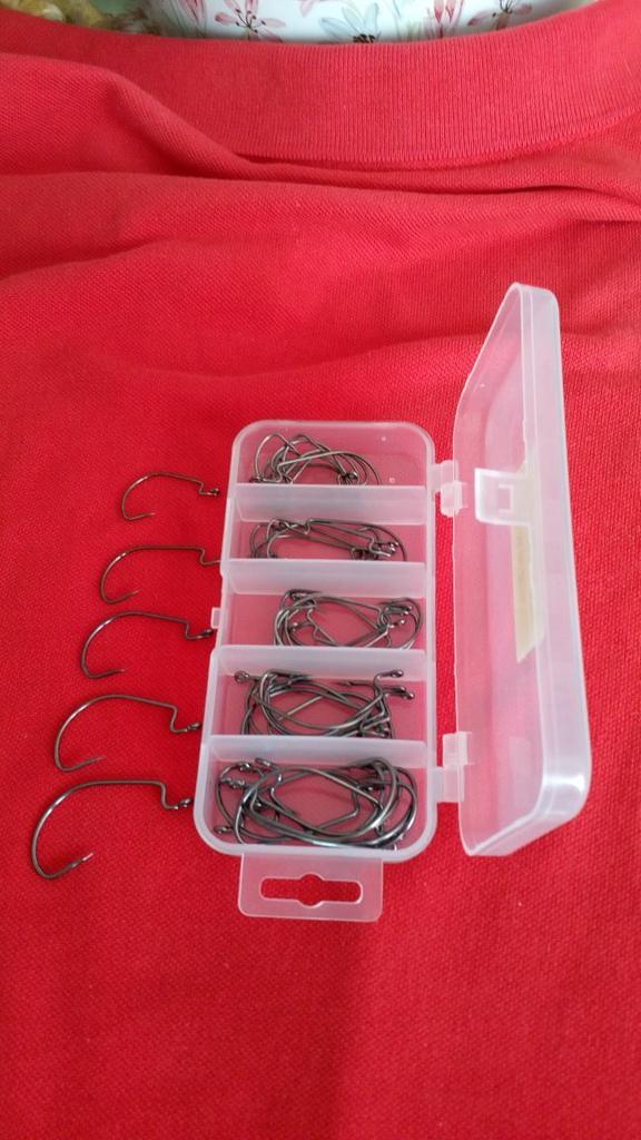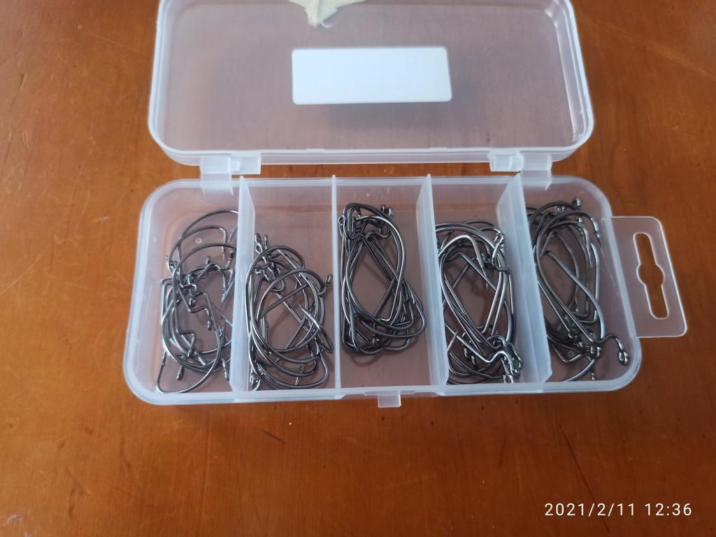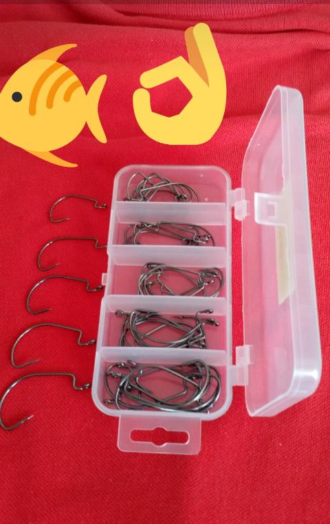 Cârlige offset pentru pescuitul 🎣 peștilor 🐠 răpitori.50 de buc de dimensiuni diferite (10 buc*5 =50 buc).De bună calitate ,nu se îndoiesc și nu se rup repede 👌.Fabricate din sârmă de oțel cu grosimea de 1mm.Foarte bine ascuțite ,cu spinul care agață peștele repede și bine.Un mare avantaj e cutia de depozitare încăpătoare și bine compartimentată.Recomand👍,am folosit și sunt foarte mulțumit de ele👍👍.