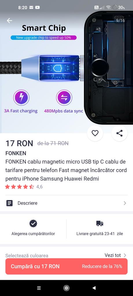 Cablu este bun dar nu este la parametrii specificati. Acolo scrie la 3A si telefonul meu spune ca nu merge la incarcare rapida. Cablul ce il am (vechi) la telefon spune ca se incarca rapid.