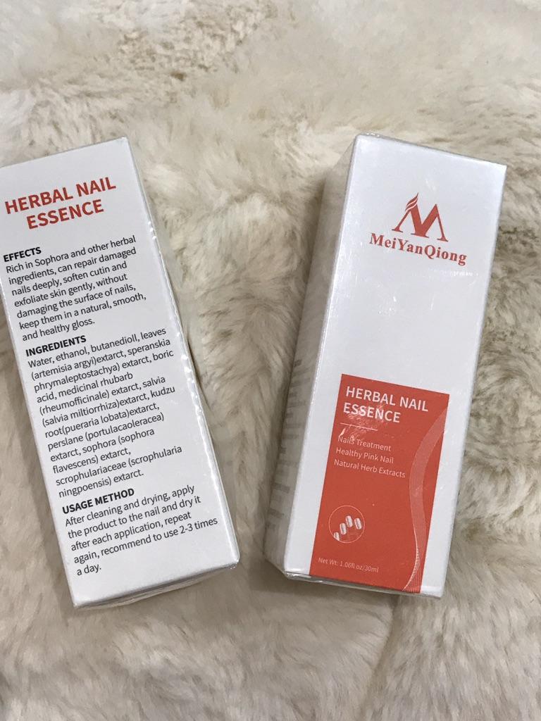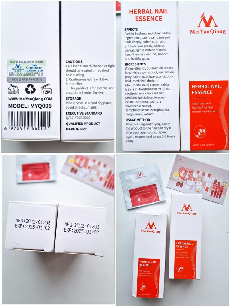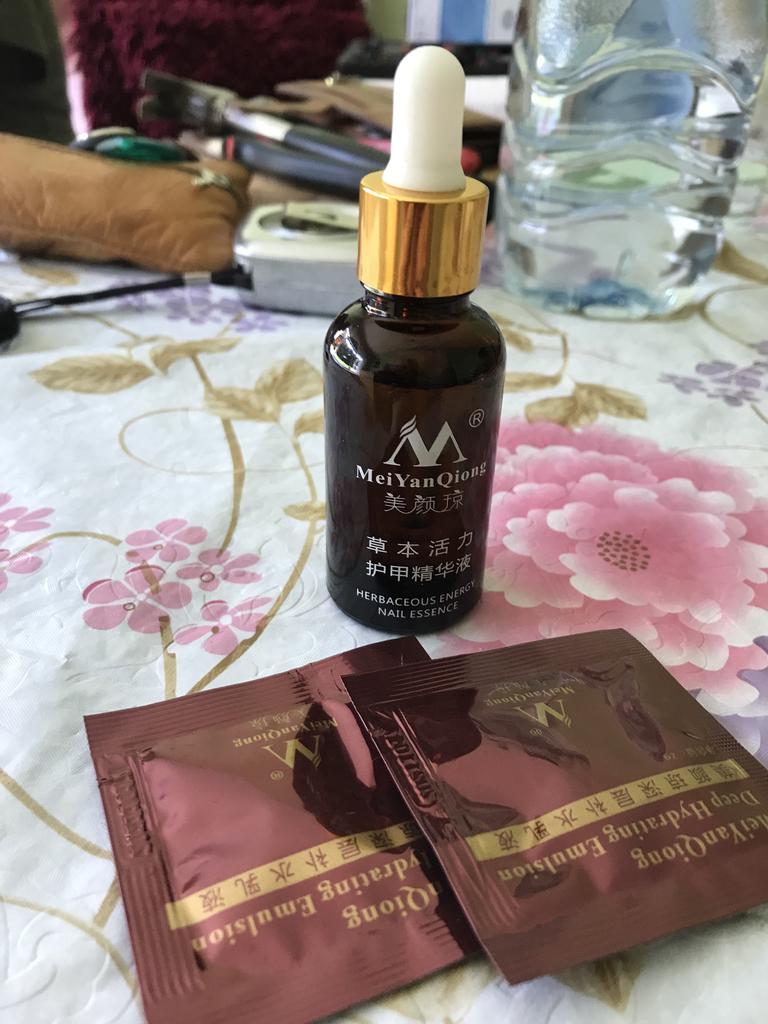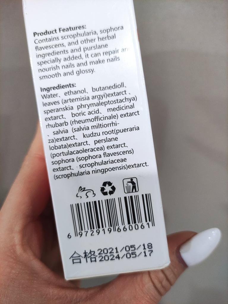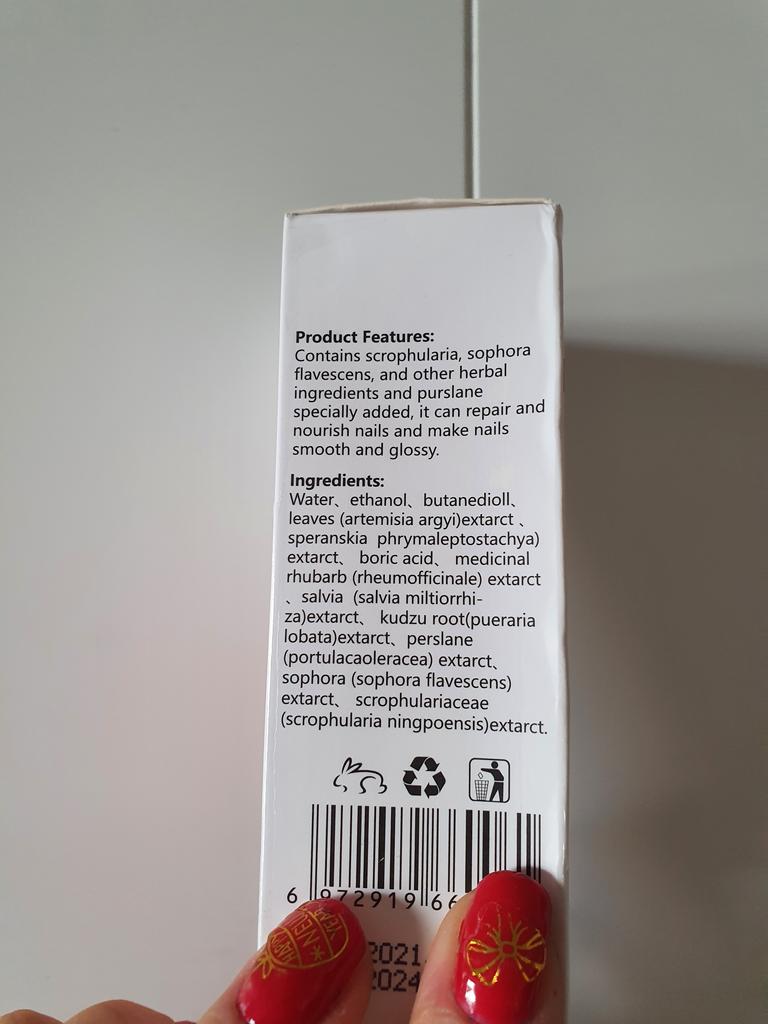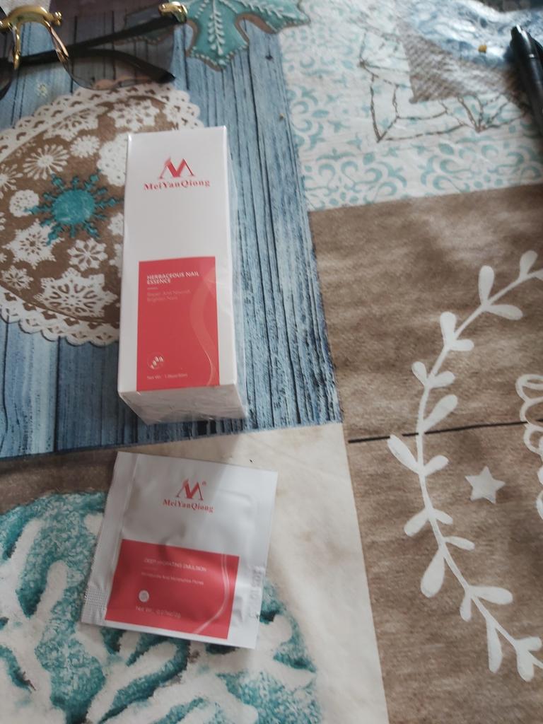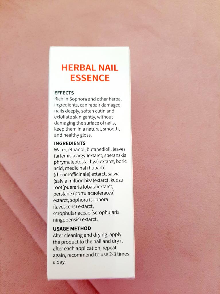 HERBAL NAIL ESSENCE de MeiYanQiong! ❤️ EFECTE: Bogat în Sophora și alte ingrediente din plante, poate repara unghiile deteriorate în profunzime, înmoaie cutina și exfoliează pielea ușor, fără a deteriora suprafața unghiilor, le păstrează într-un luciu natural, neted și sănătos.. INGREDIENTE: Apă, etanol, butandiol, frunze (artemisia argyi) extarct, speranskia (phrymaleptostachya) extarct, boricacid, rabarbă medicinală (rheumofficinale) extarct, salvia (salvia miltiorrhiza) extarct, rădăcină de kudzu (pueraria lobata), extarctportulatarcatoleracea (extarct) (sophora flavescens) extarct,scrophulariaceae (scrophularia ningpoensis) extarct. METODA DE UTILIZARE: După curățare și uscare, se aplică produsul pe unghie și se usucă după fiecare aplicare, se repetă din nou, se recomandă utilizarea de 2-3 ori pe zi. Livrarea a durat o lună pentru a ajunge în Grecia. 🇬🇷 Ușor de luat cu tine! De asemenea, vânzătorul a adăugat câteva mostre gratuite de cremă pentru cadou! 🎁 100% recomandat 💯 Place ! ❤️ Vă mulțumesc și vă iubesc MeiYanQiong și Joom! ❤