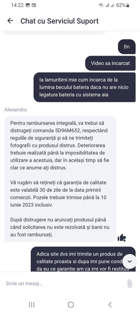 Am luat unu si nu lucra, au zis sa fac video, ca sa il stric sa imi intoarca banii, si le ziceam ca nu functioneaza dupa descrierile produsului. Am procurat altul nou si are aceeasi problema nu se incarca de la lumina becului ,doar la priza si tine 2 maximum 3 zile.