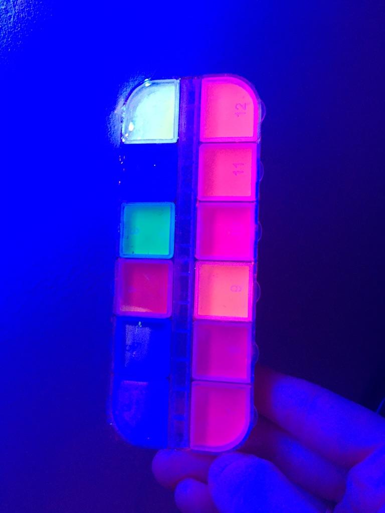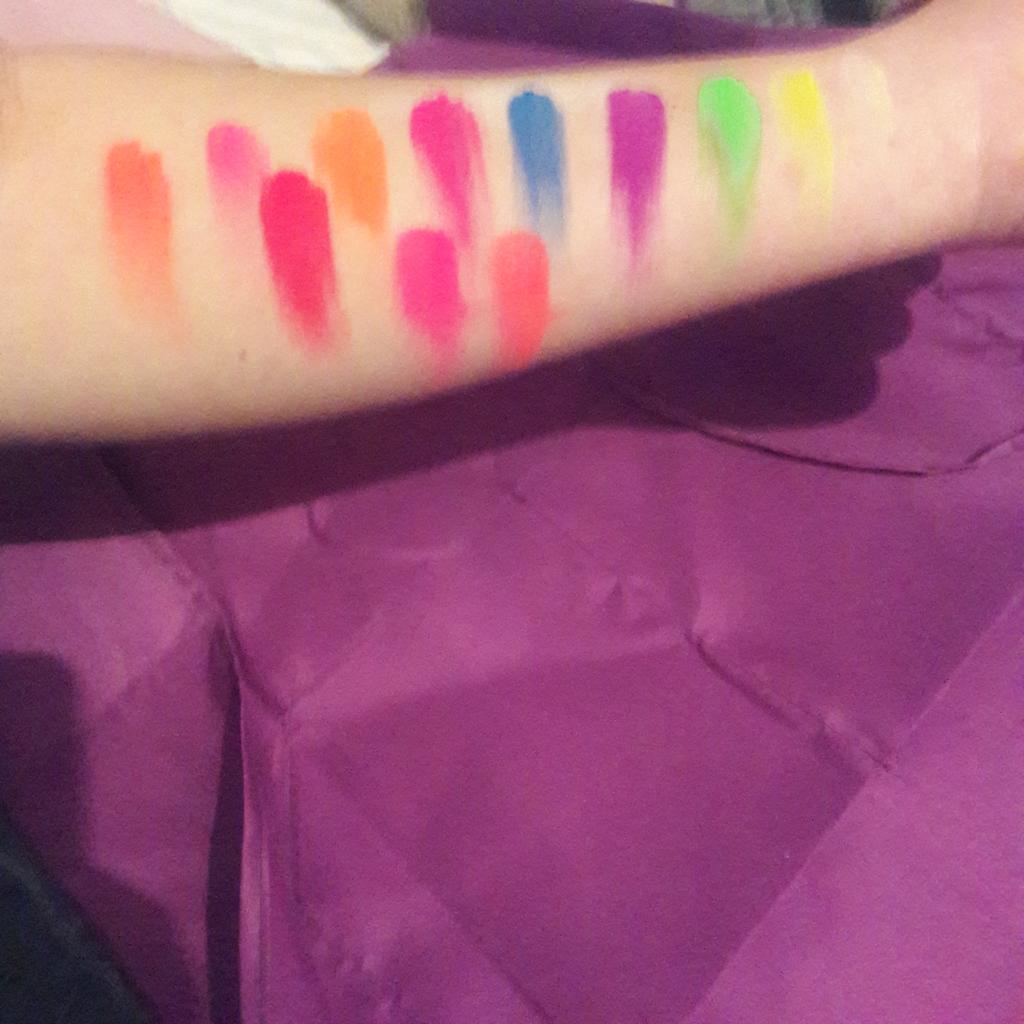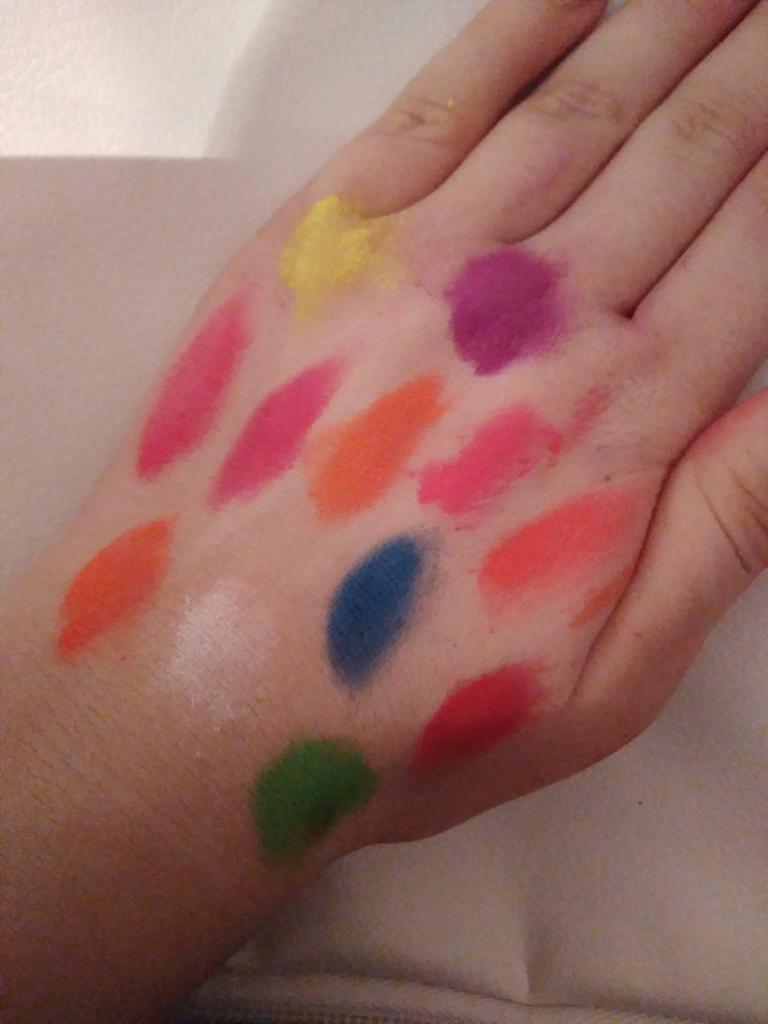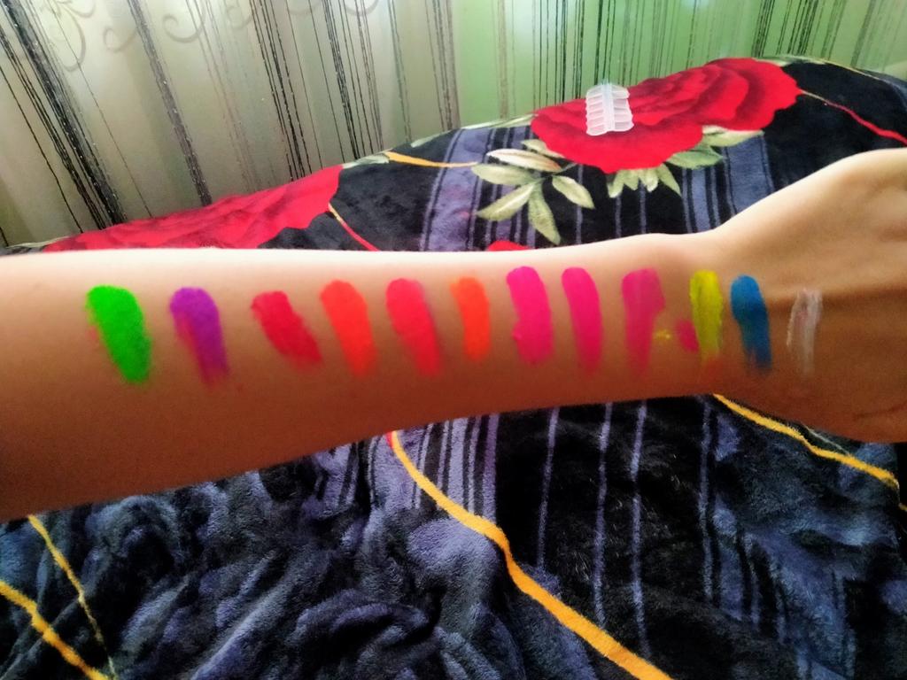 Pigmenți incredibil de strălucitori. Chiar și pe piele după machiaj lăsați o nuanță. Trebuie aplicat cu grijă, deoarece hainele vor fi spălate imediat.
