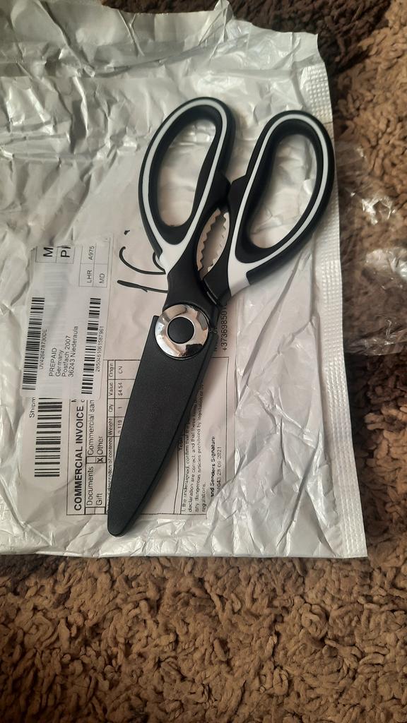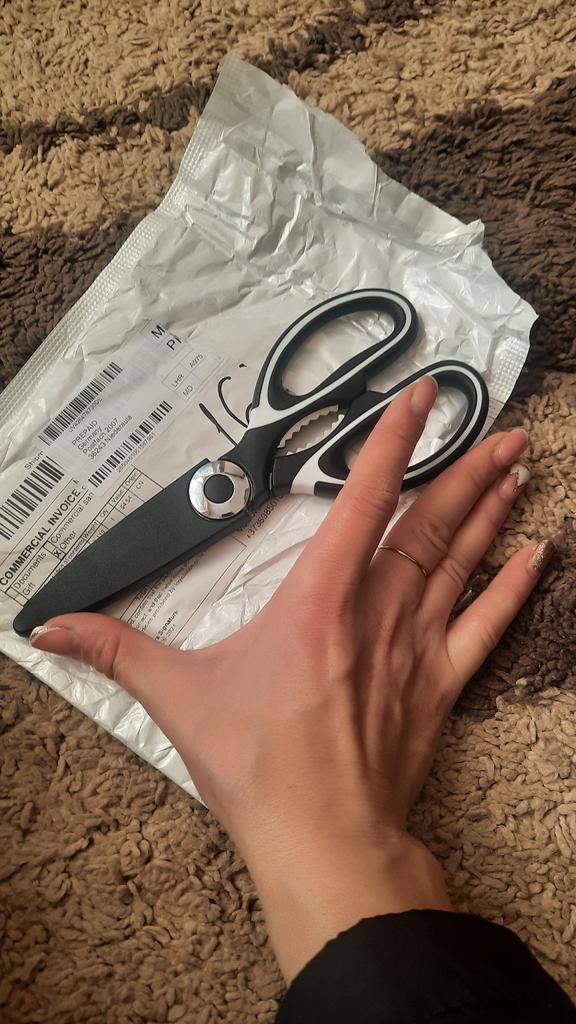 Foarfeca de bucătărie este perfect ca în imagine, împachetat bine,defecte nus,comanda a fost data pe 26.10 .21-17.11.21,sunt foarte mulțumită și recomand cu încredere produsul, mulțumim producătorilor și magazinul Joom.