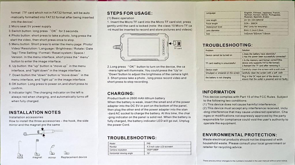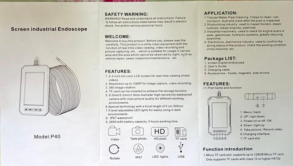 Dispozitivul funcționează perfect, există un slot pentru un card de memorie, capacitatea de a înregistra videoclipuri și fotografii. Ideal pentru testarea țevilor și canalelor de cabluri. Știam pe cutie că este rezistent la apă.