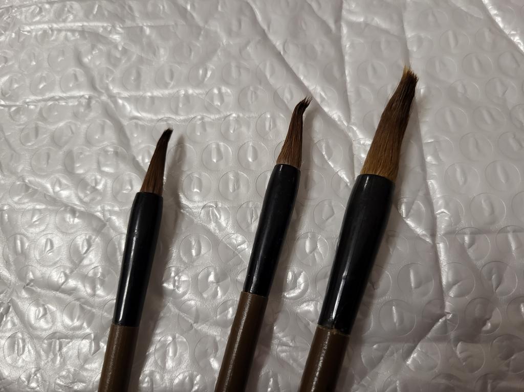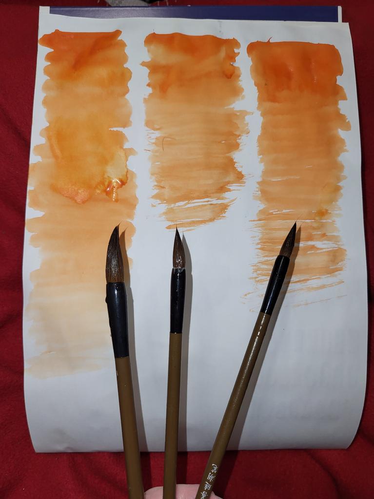 Au ajuns cam strâmbi, dar când am udat periile s-au îndreptat👍🏻 Absoarbe apa si vopsesc perfect. Fotografia arată cât de mult pigment poate emite fiecare pensulă.. Din minusuri: au renunțat puțin 🙈