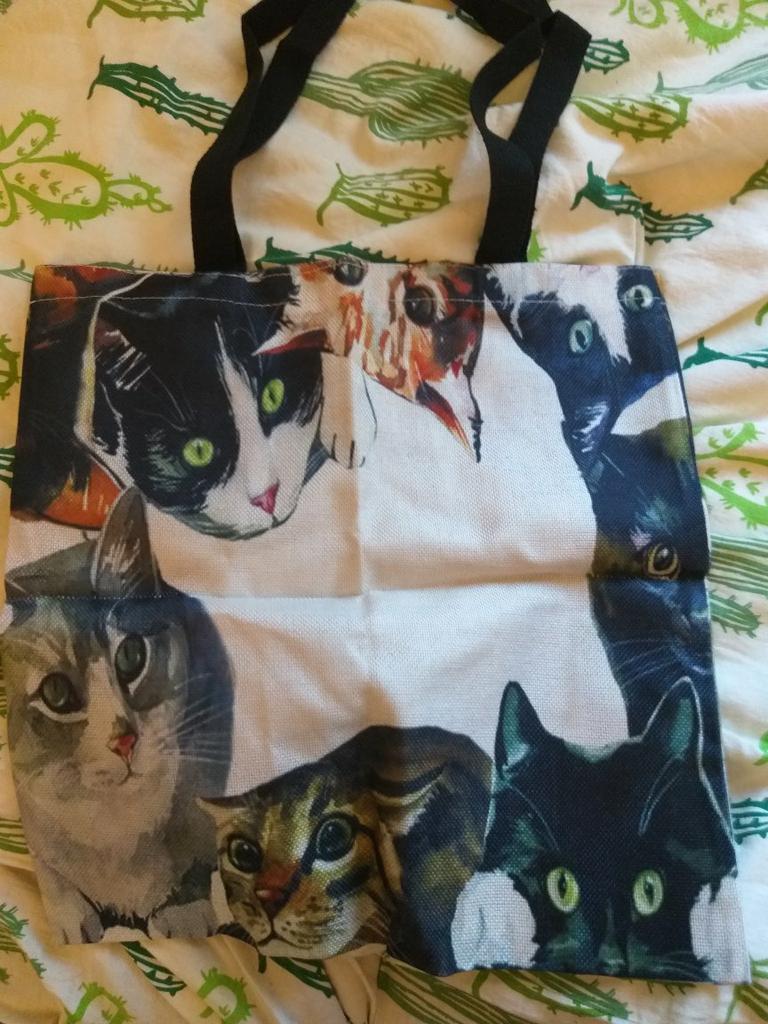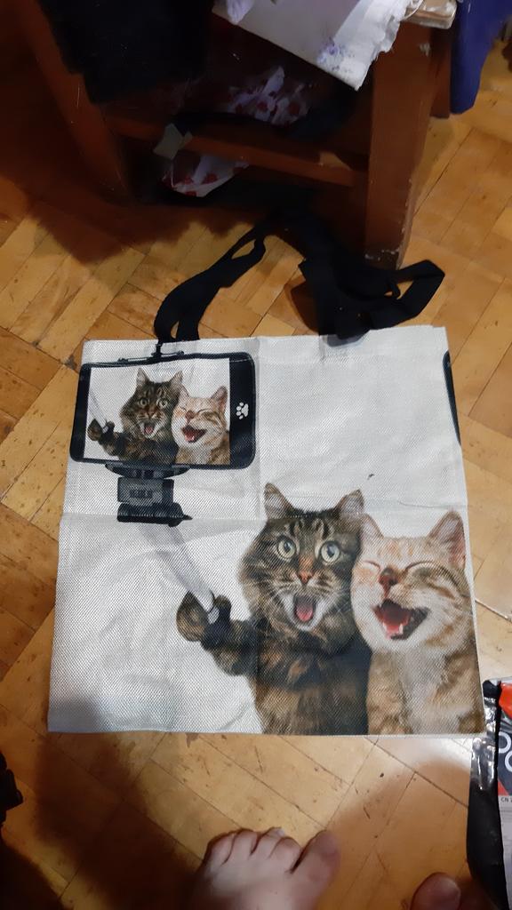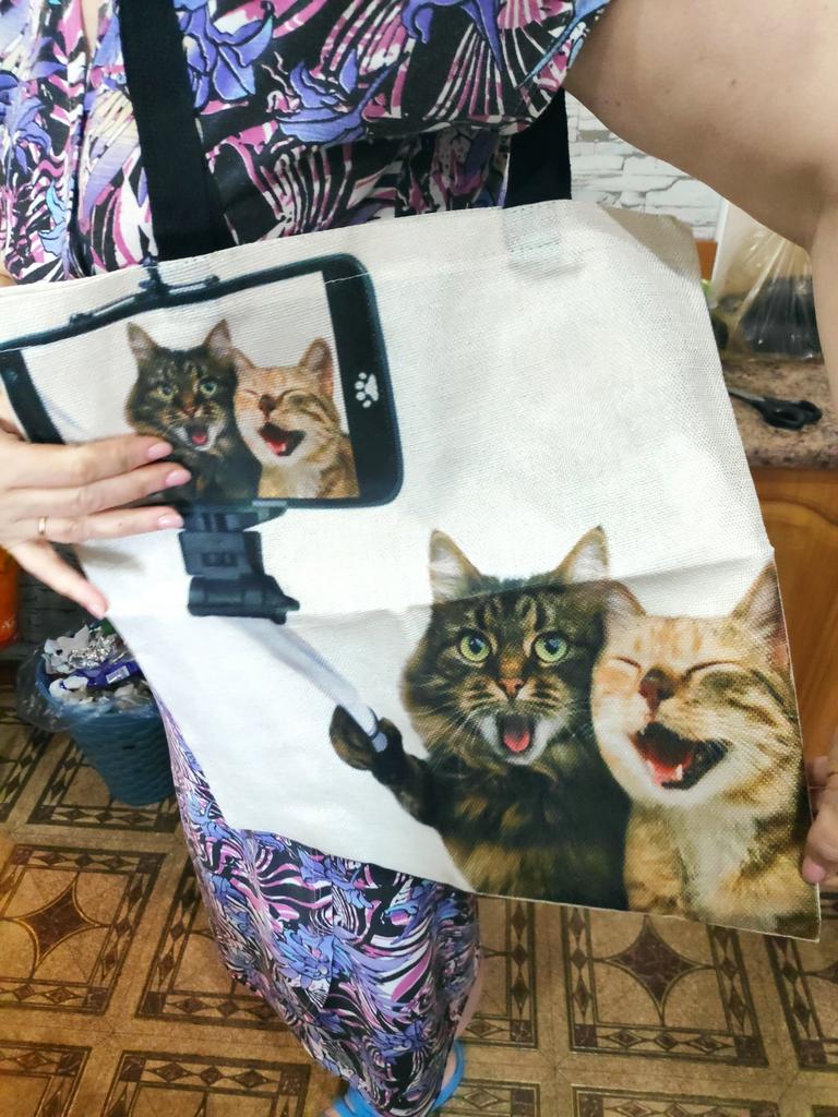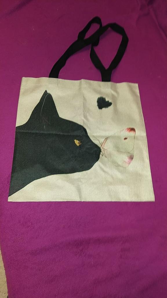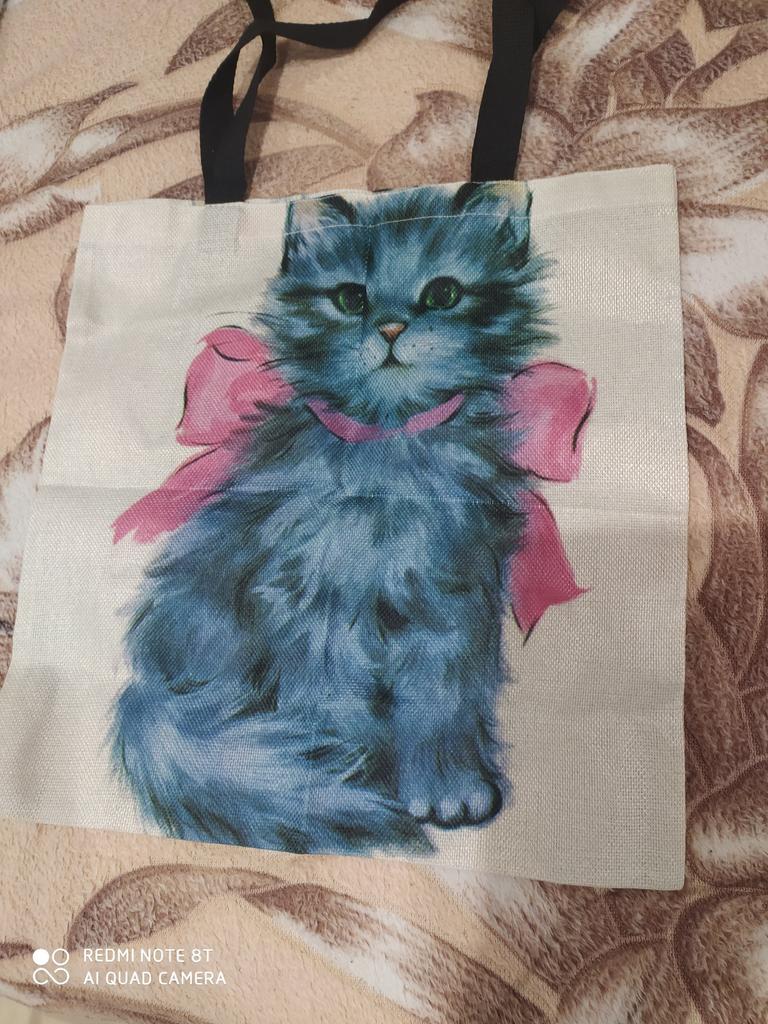 Abia așteptam sacul de cumpărături și apoi am fost destul de dezamăgit. Materialul este de bună calitate, cusăturile sunt practic bune, dar geanta nu arată nici pe departe la fel de frumos ca ceea ce este în ofertă. Spre comparatie o poza cu oferta si una cu sacul de cumparaturi. Urechi tăiate în partea de sus, culoare albăstruie a pisicii și reprezentare neclară a blanii și a feței. Milă!!!