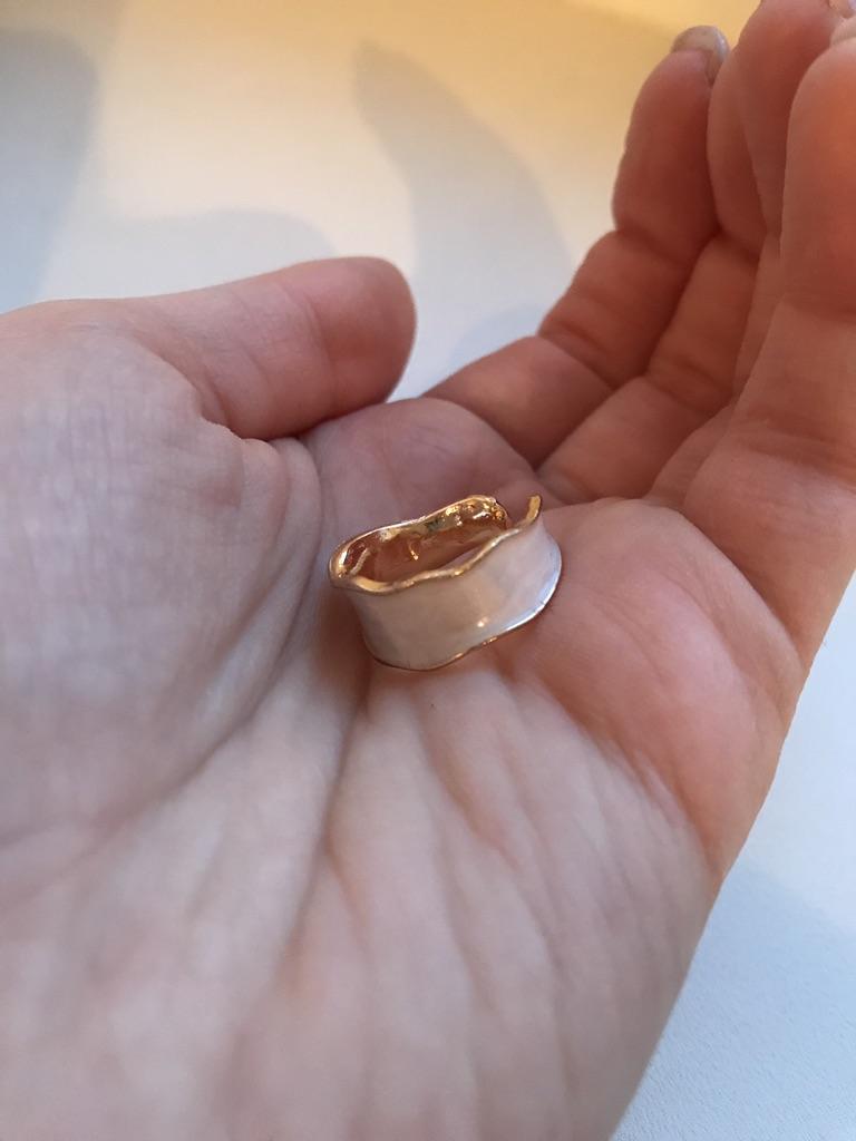 Un frumos inel metalic. Ca în fotografie, dar inelul galben este puțin mai palid în persoană. Există o asperitate de șlefuire pe revers, dar nu m-a supărat. Marimea este reglabila, dar trebuie facuta foarte treptat, deoarece se poate rupe. Vă recomand