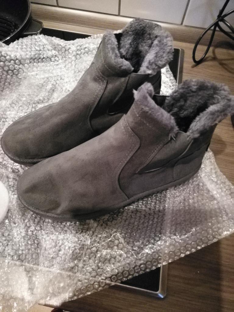 Timp de livrare 2,5 săptămâni 👍. Pentru mine, aceste cizme de iarnă sunt ideale pentru ieșiri cu câinele sau la brutărie etc. Îi iei repede și pleci. Cauciucul de pe ambele părți este, de asemenea, drăguț și elastic, astfel încât să poți intra bine chiar și cu picioarele mai groase. Ca marime, am mers conform tabelului cu marimi si se potrivesc atat de bine, de obicei am o marime. 41/42 în încălțăminte și cred că Gr. Luarea 44 aici a fost decizia corectă. Sunt complete în interior. căptușită cu blană moale de pluș. Încă mai miros puțin chimic, dar cred că asta va dispărea în timp. Pe descriere scrie piele intoarsa dar ma indoiesc ca e piele reala la pret, dar nu conteaza, cu siguranta imi plac. as recomanda-o.