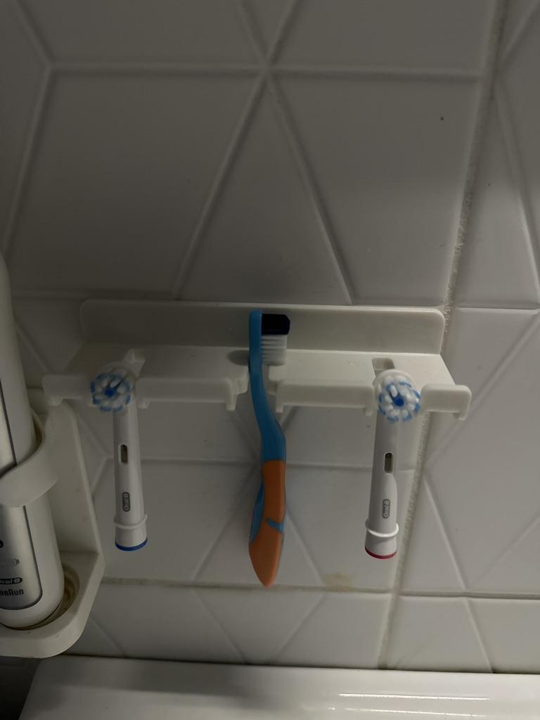 Plastic bun, ținut ferm pe perete. Îl folosesc ca suport pentru periuțe de dinți, poți pune și un telefon deasupra))