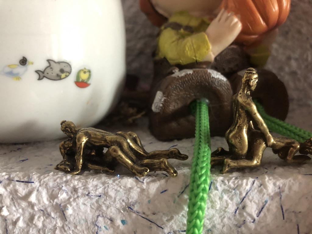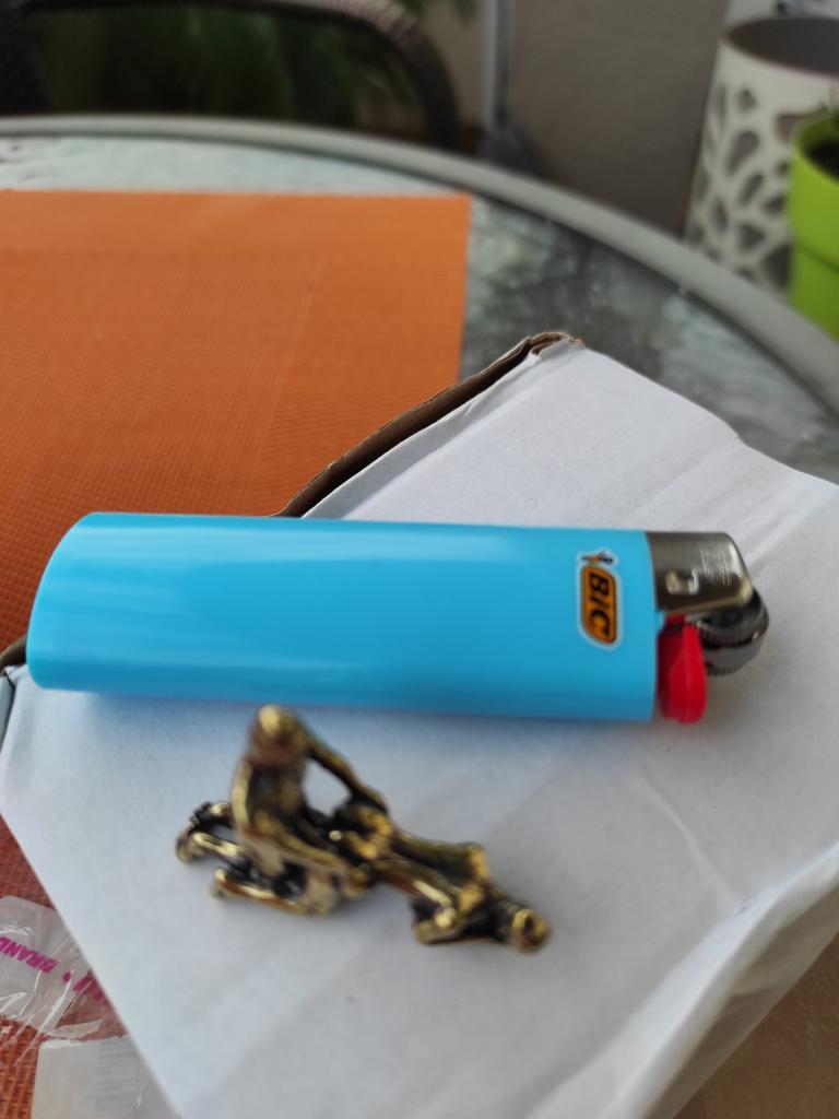 O macroscultură din alamă. Am crezut că e mai mare, măcar cât un pachet de țigări. Este chiar mai mic decât o brichetă standard pe gaz. Având în vedere dimensiunea, ar fi trebuit atașat un ochi pentru a-l folosi ca amuletă sau breloc. Din păcate, cifra nu are prea mult sens