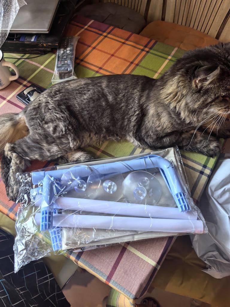 A așteptat mult timp. Dar a venit azi. Usor de asamblat. Prelucrare ieftină. Ventuzele nu țin toate bine chiar și fără pisică. A meritat încercat.