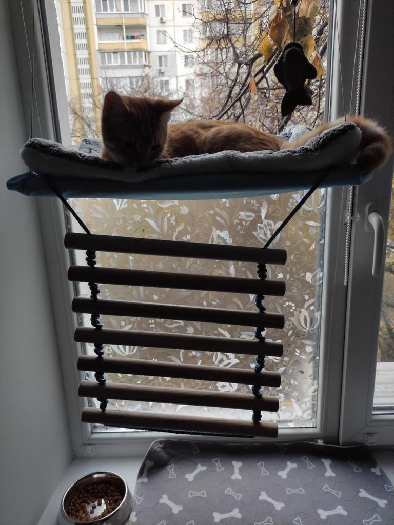 Pisica noastră se pare că nu este un cățărător, abia l-au ademenit pe acest hamac și a trebuit să-l agățăm noi înșine cu bunătăți și jucării.